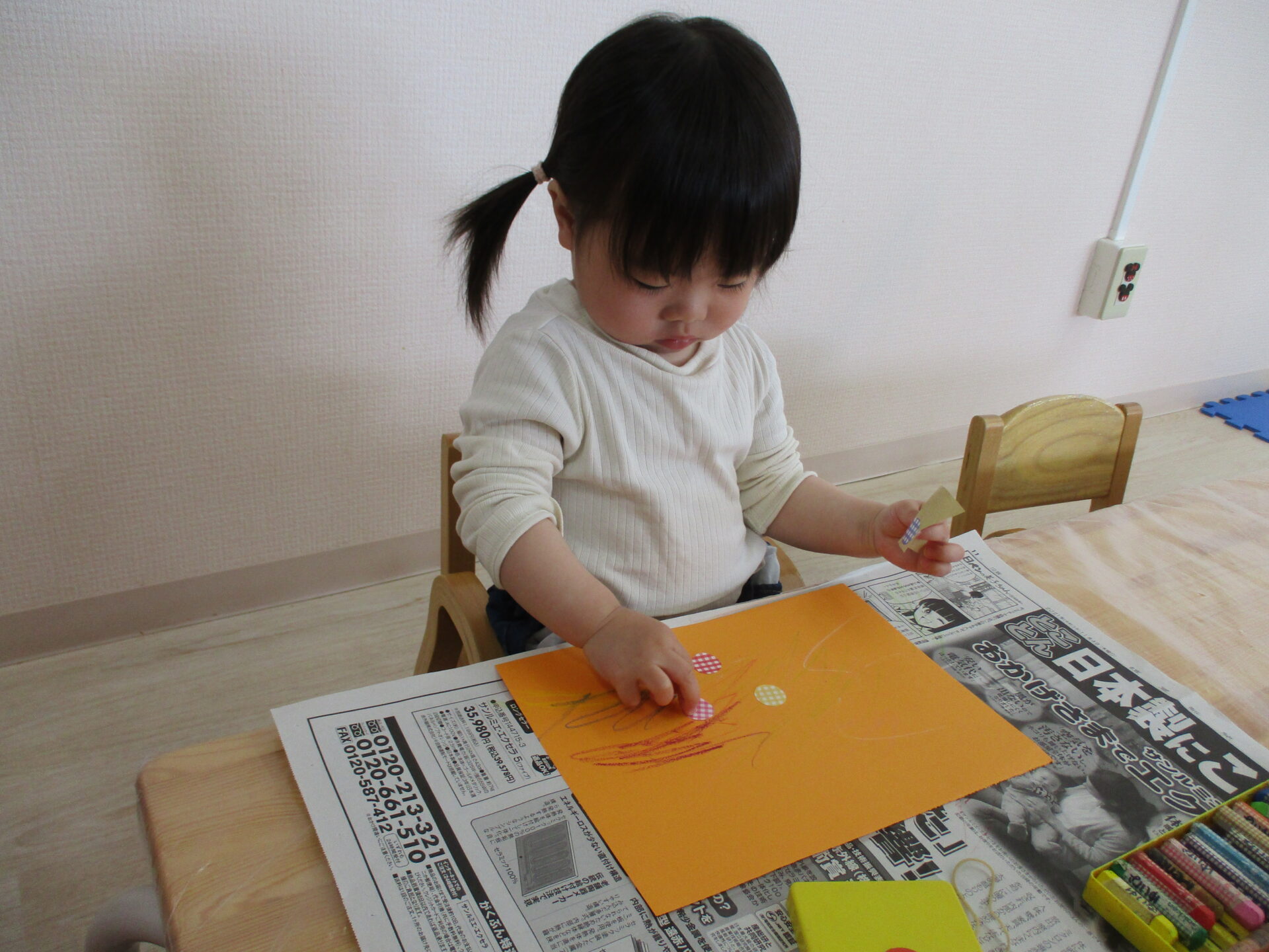 まずは、好きな色の画用紙を選んで、クレヨンでお絵描きをしました。