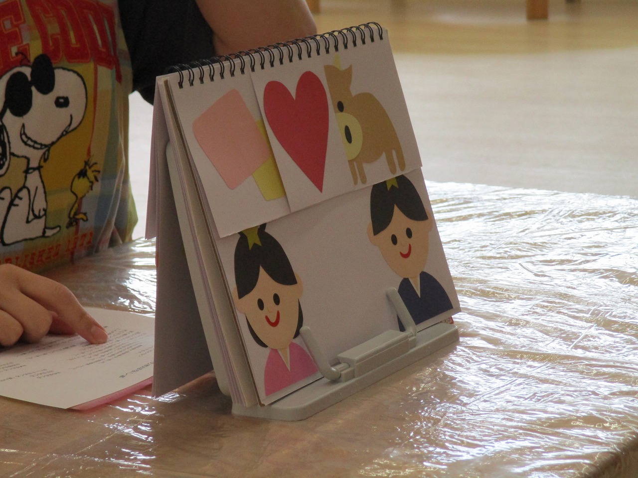 みんなで作った笹飾りを飾って、七夕会が始まりました。 まず、七夕の由来についてスケッチブックシアターでお話を聞きました。