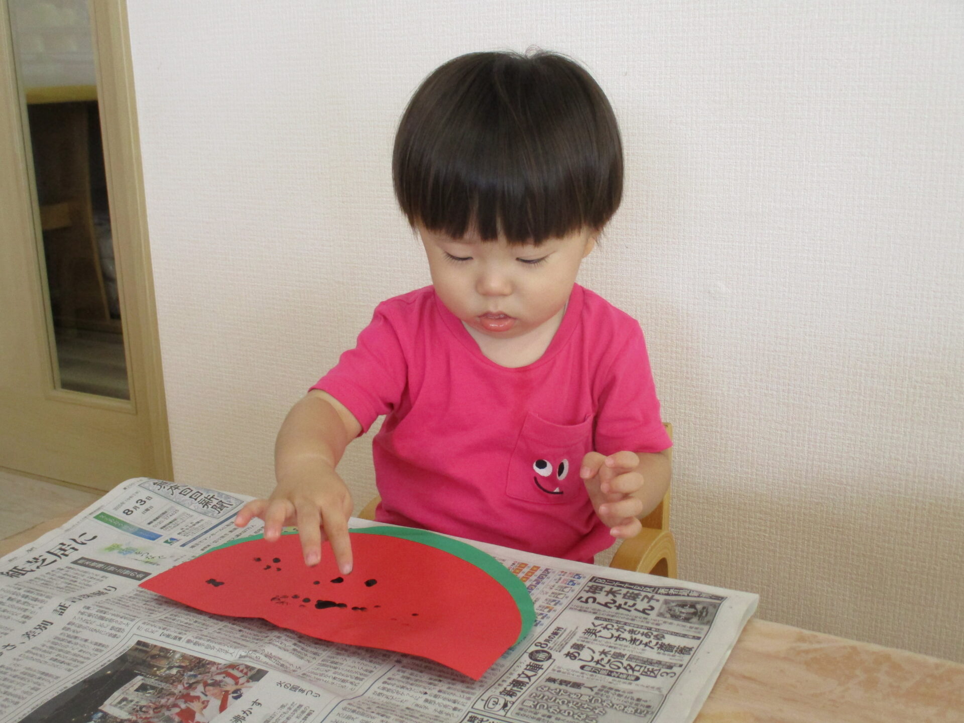 指スタンプでスイカの種を表現しました。