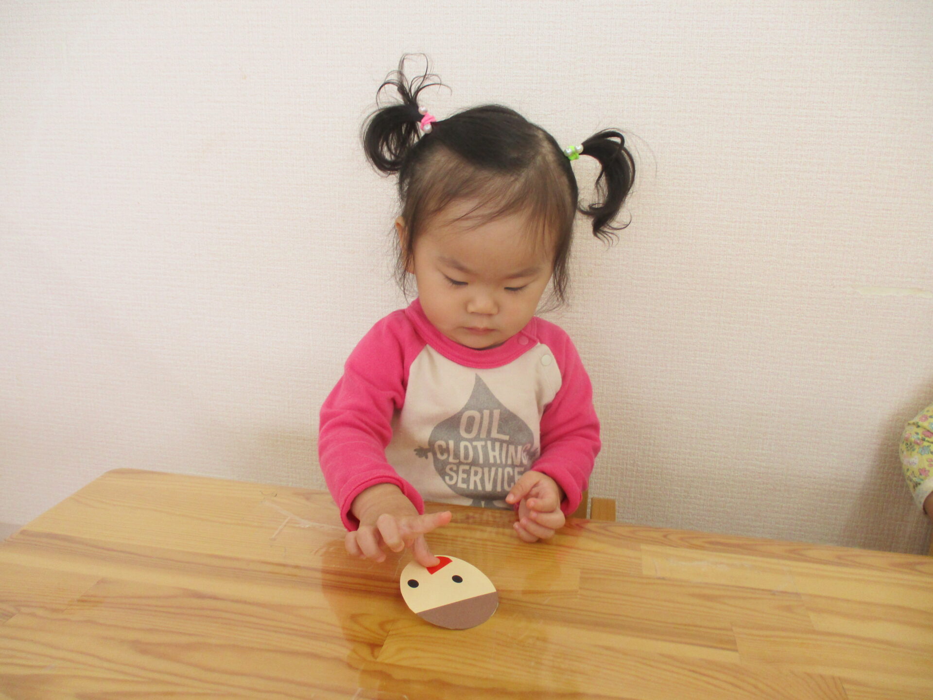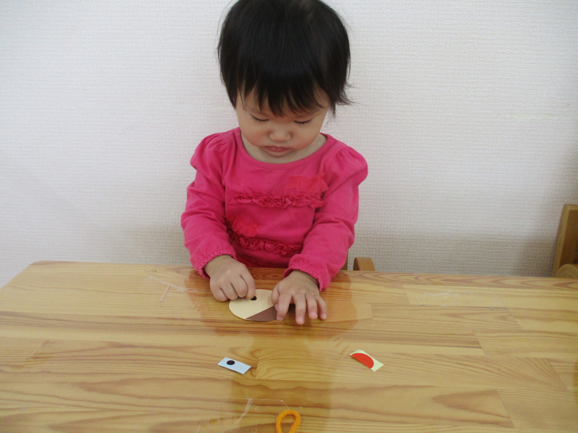 シールを手に取り「ここに目だよ」と話をしながら誘導すると、