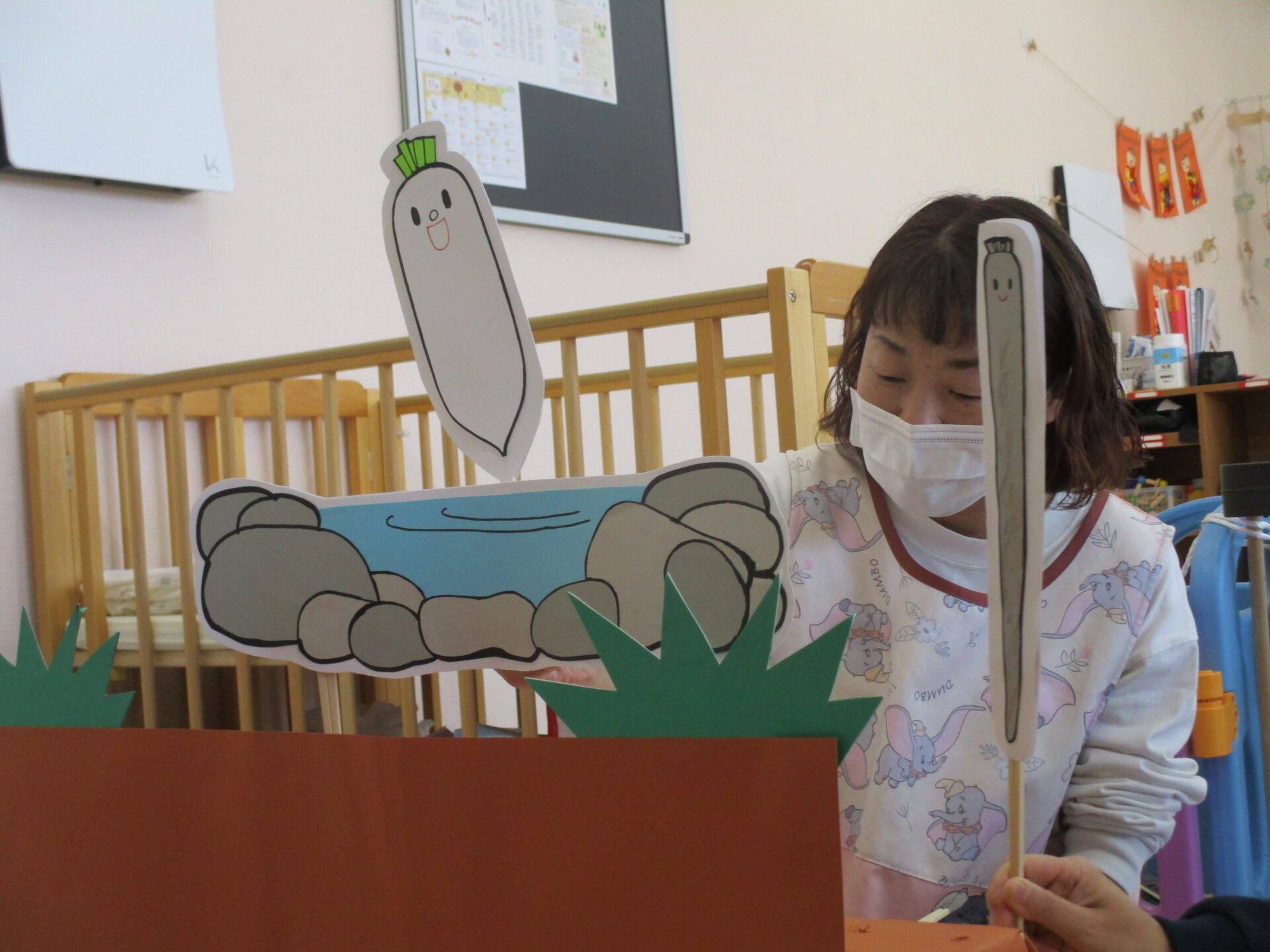 ばけたくんの絵本とやさいのお風呂のペープサートを見ました。