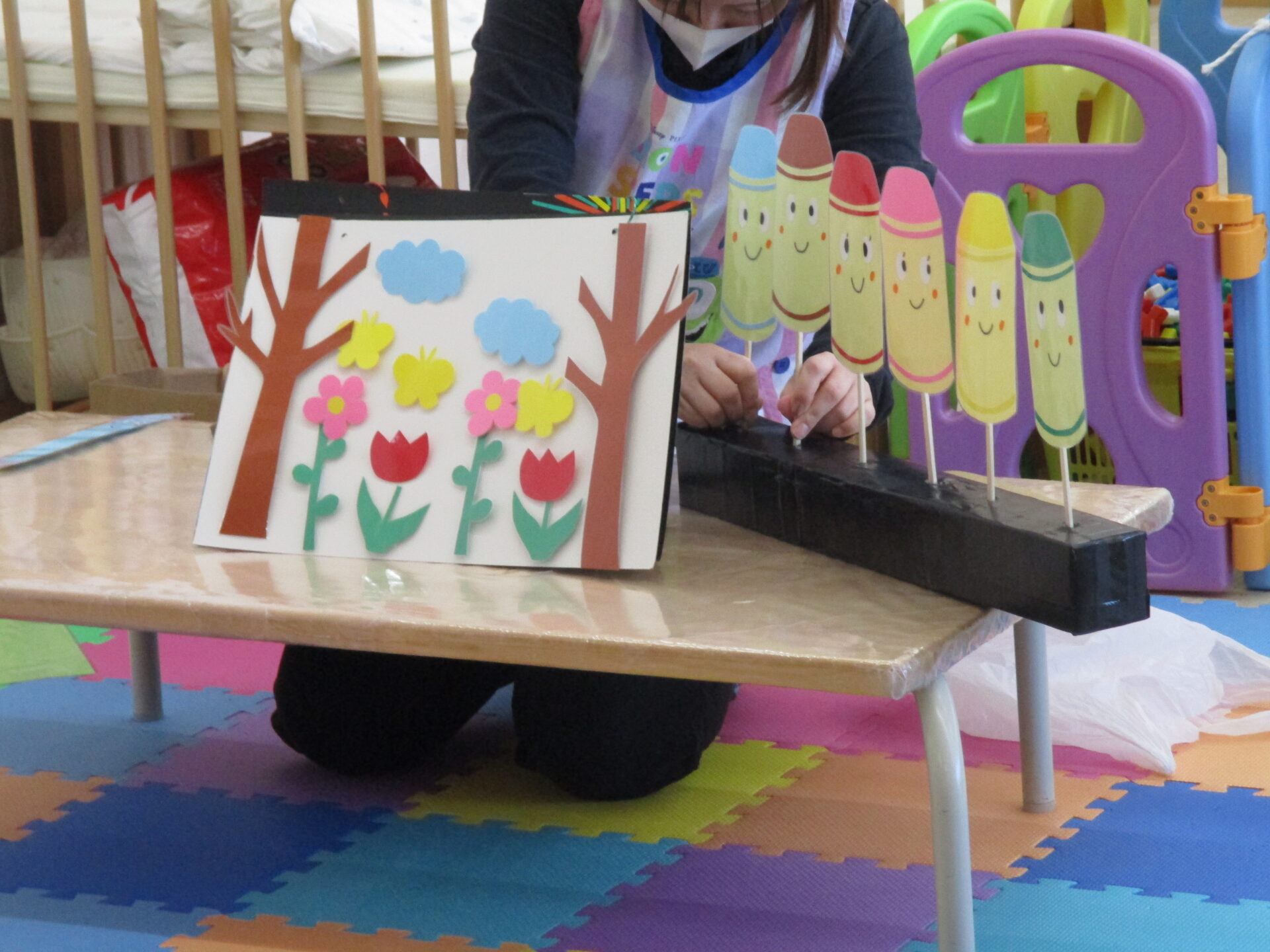 いろんな色のクレヨンたちが描く絵を興味津々で見ていました!!