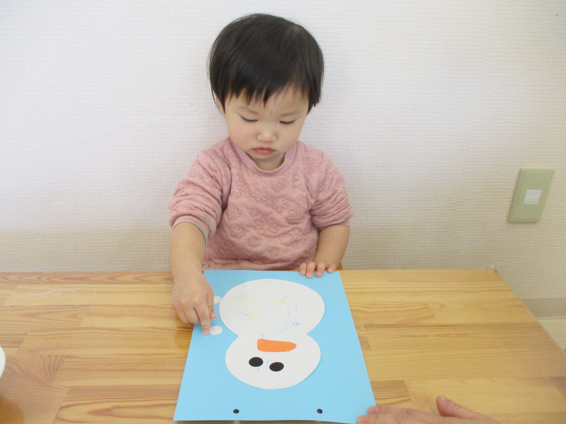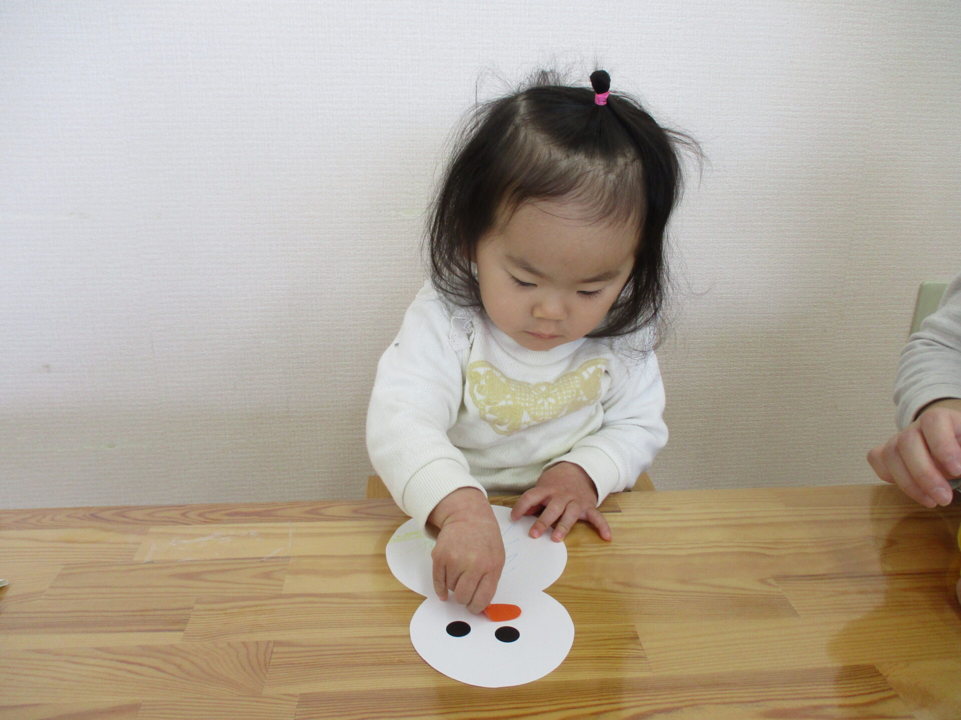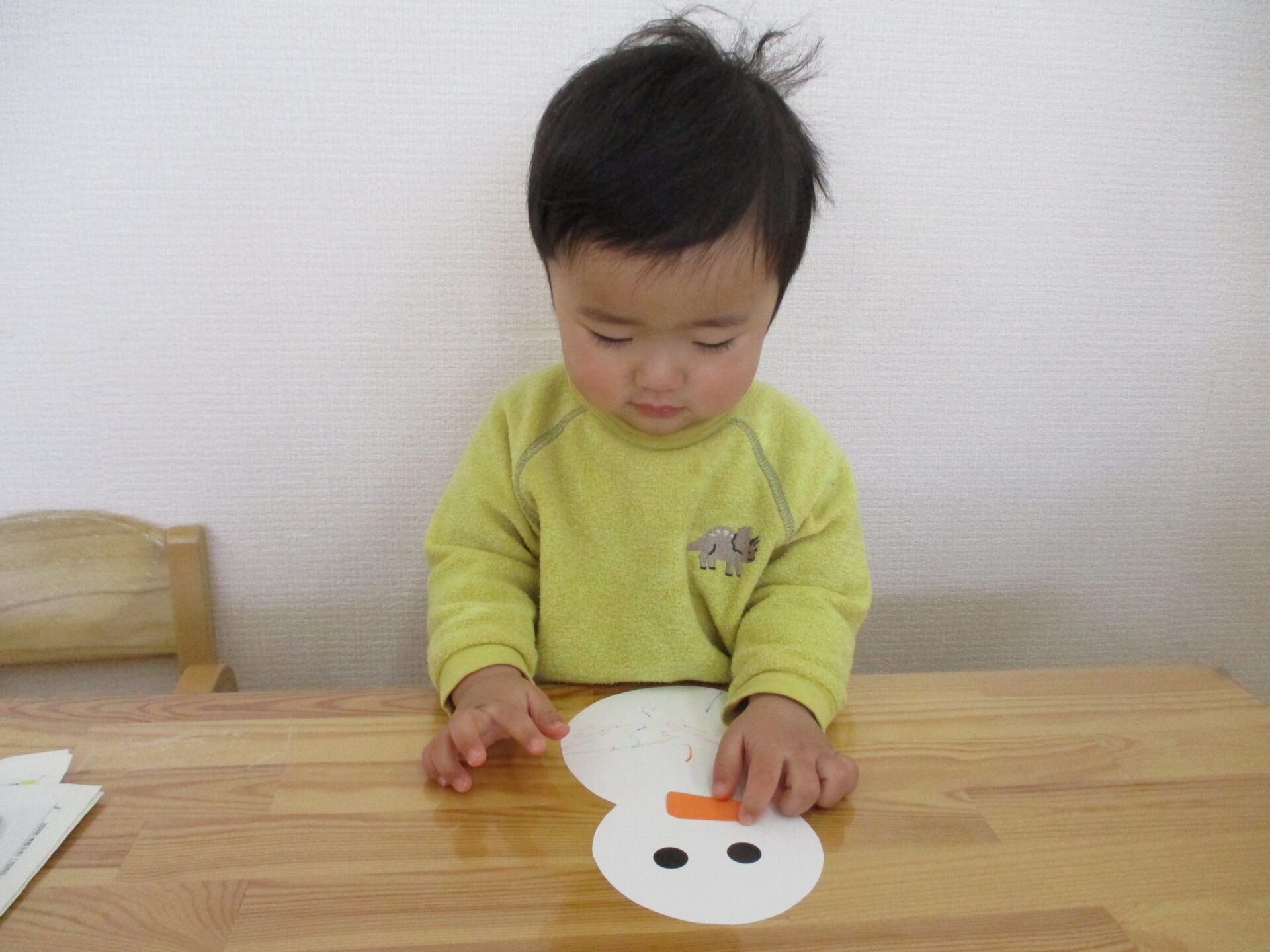 雪だるまの目と鼻、そして周りの雪をシールで飾っていきました。