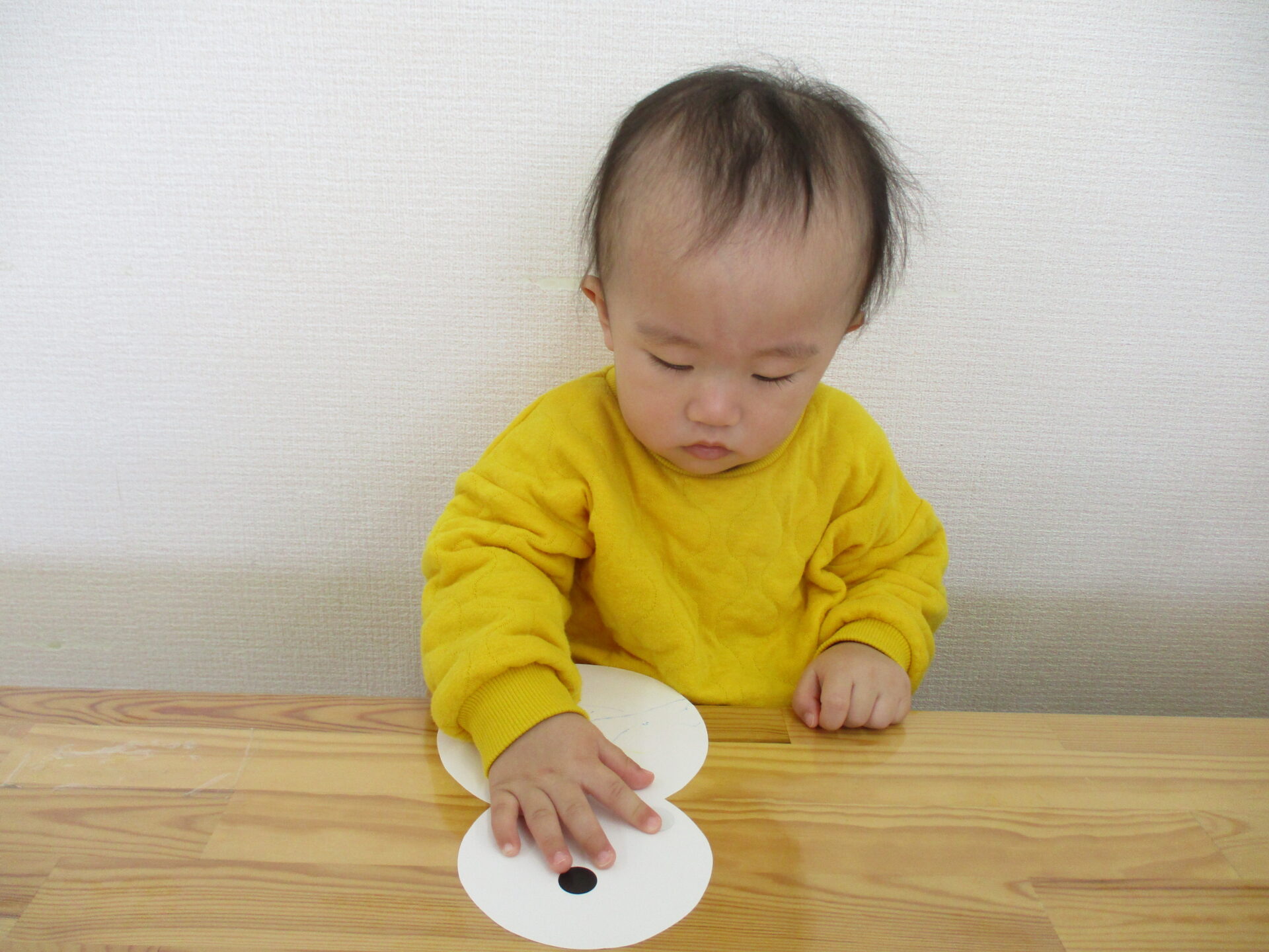 手にくっつくシールに苦戦しながらも、