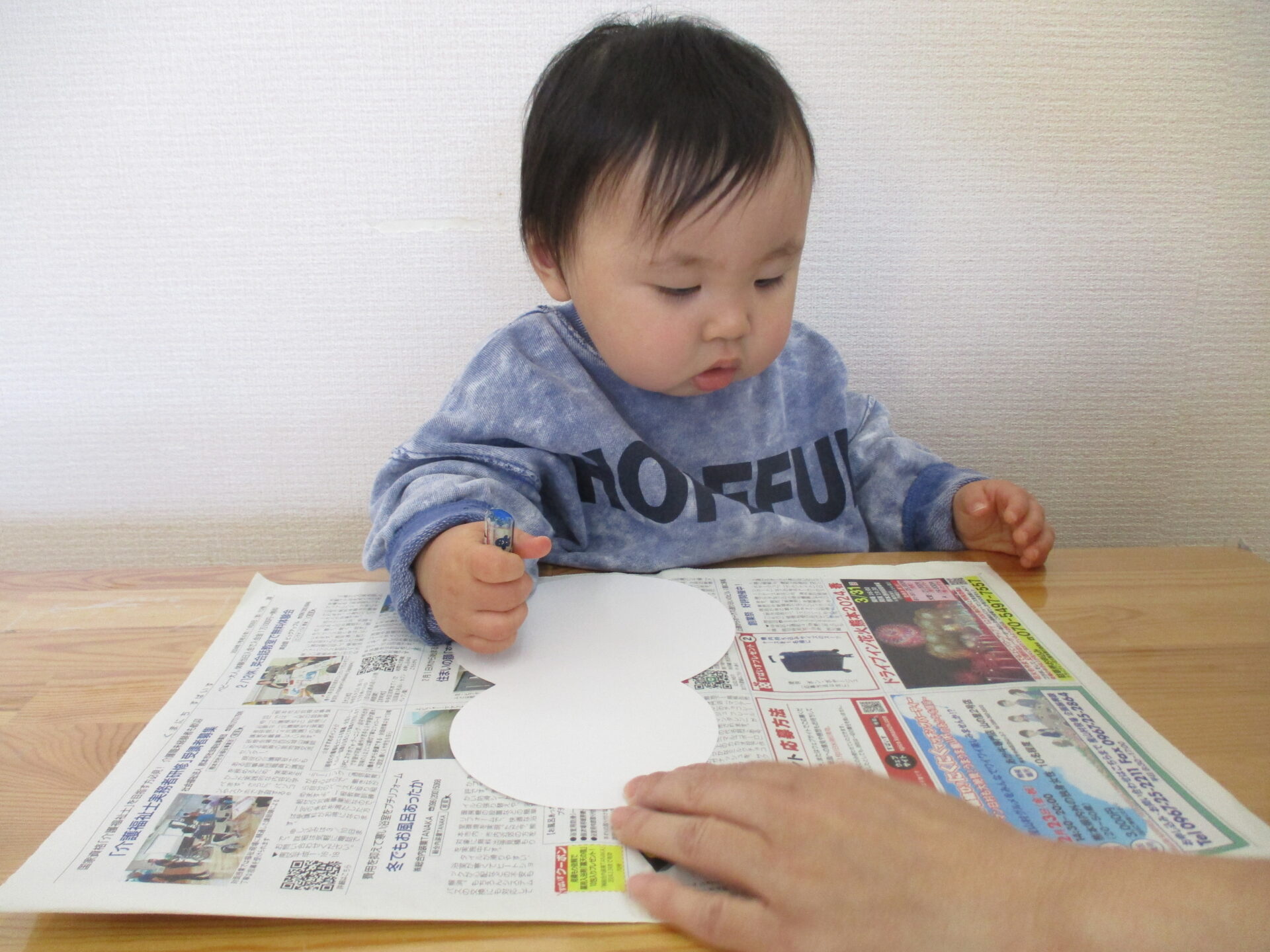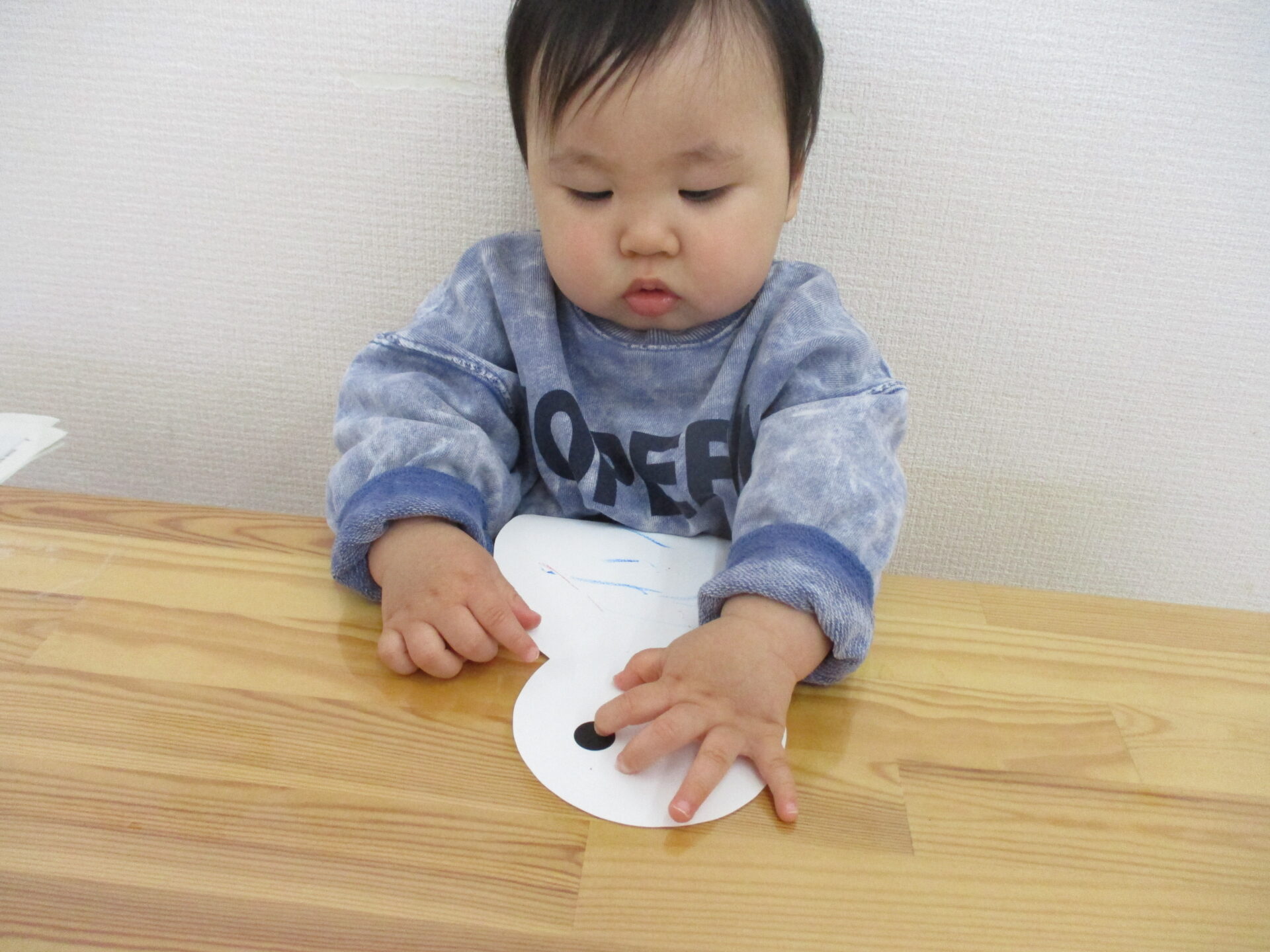 画用紙に色が付いていく様子を不思議そうに見たり、