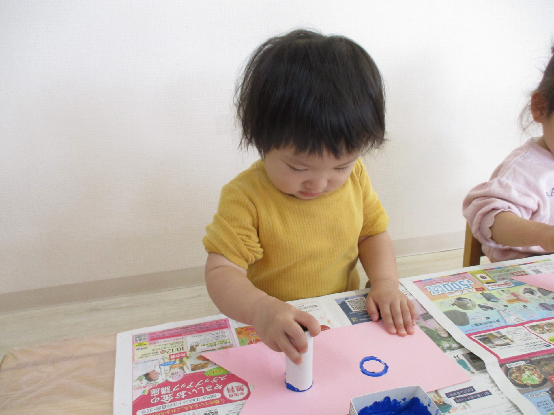 絵の具を付けたら「ぎゅ~っと押してぺったんと模様を付けていくよ~!」