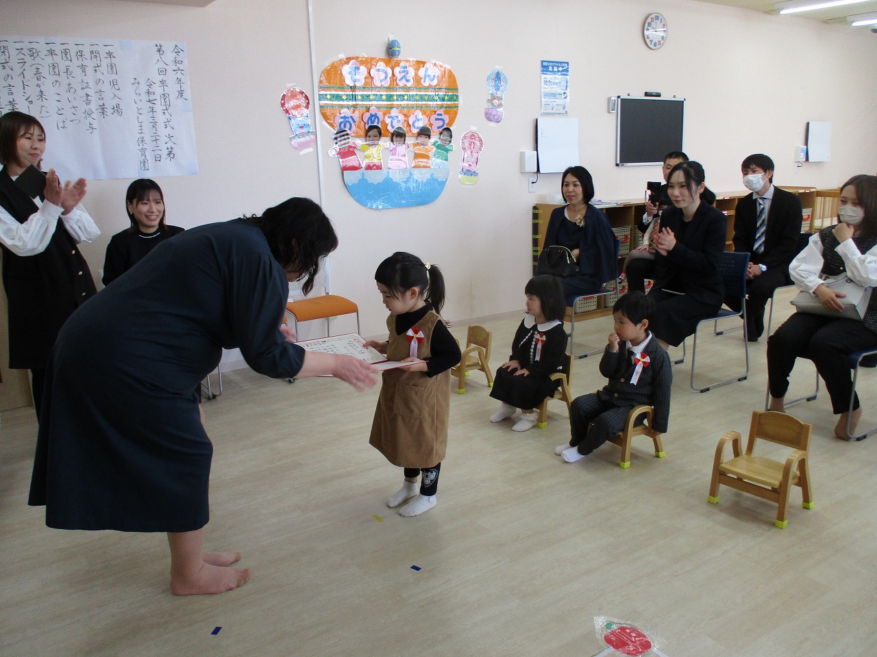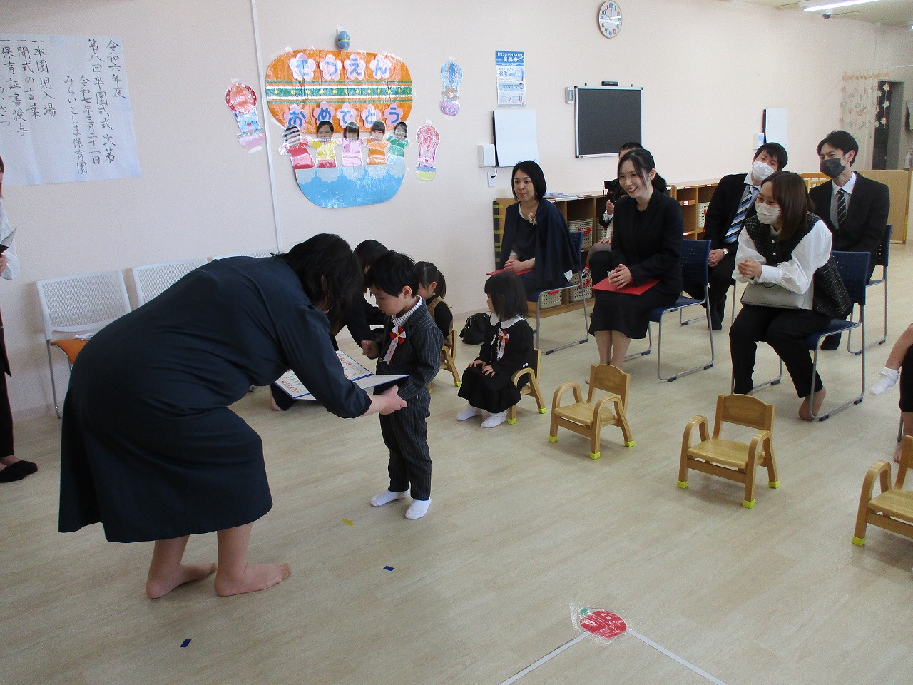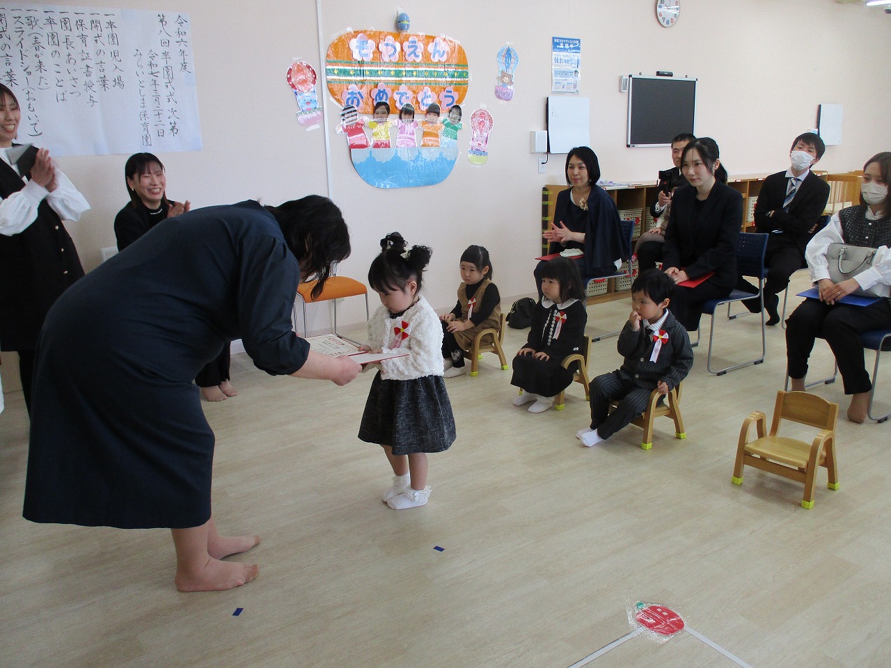子ども達は、いつもと違う雰囲気に緊張していましたが、一人ひとりしっかりと園長先生から証書を受け取っていました。