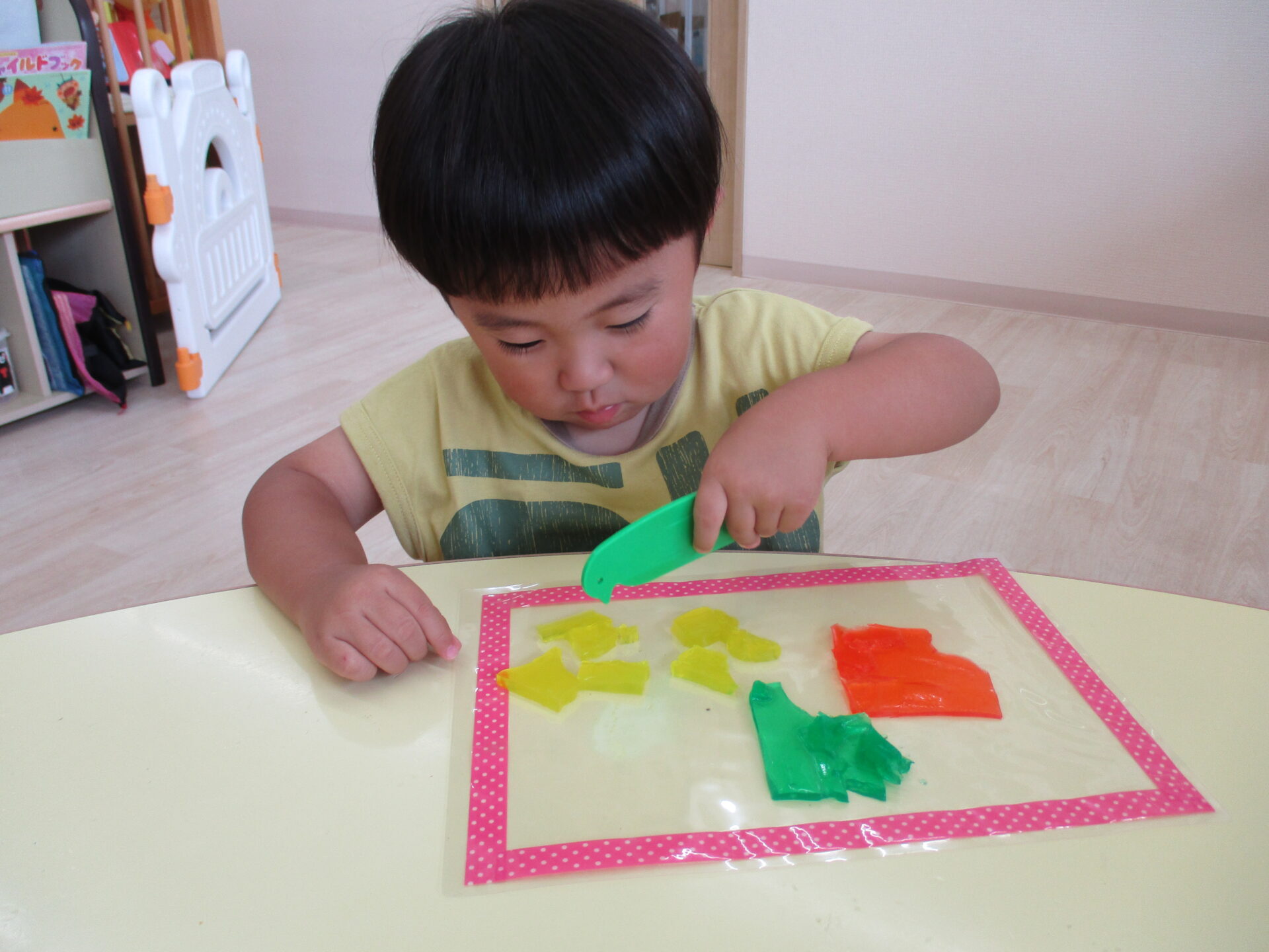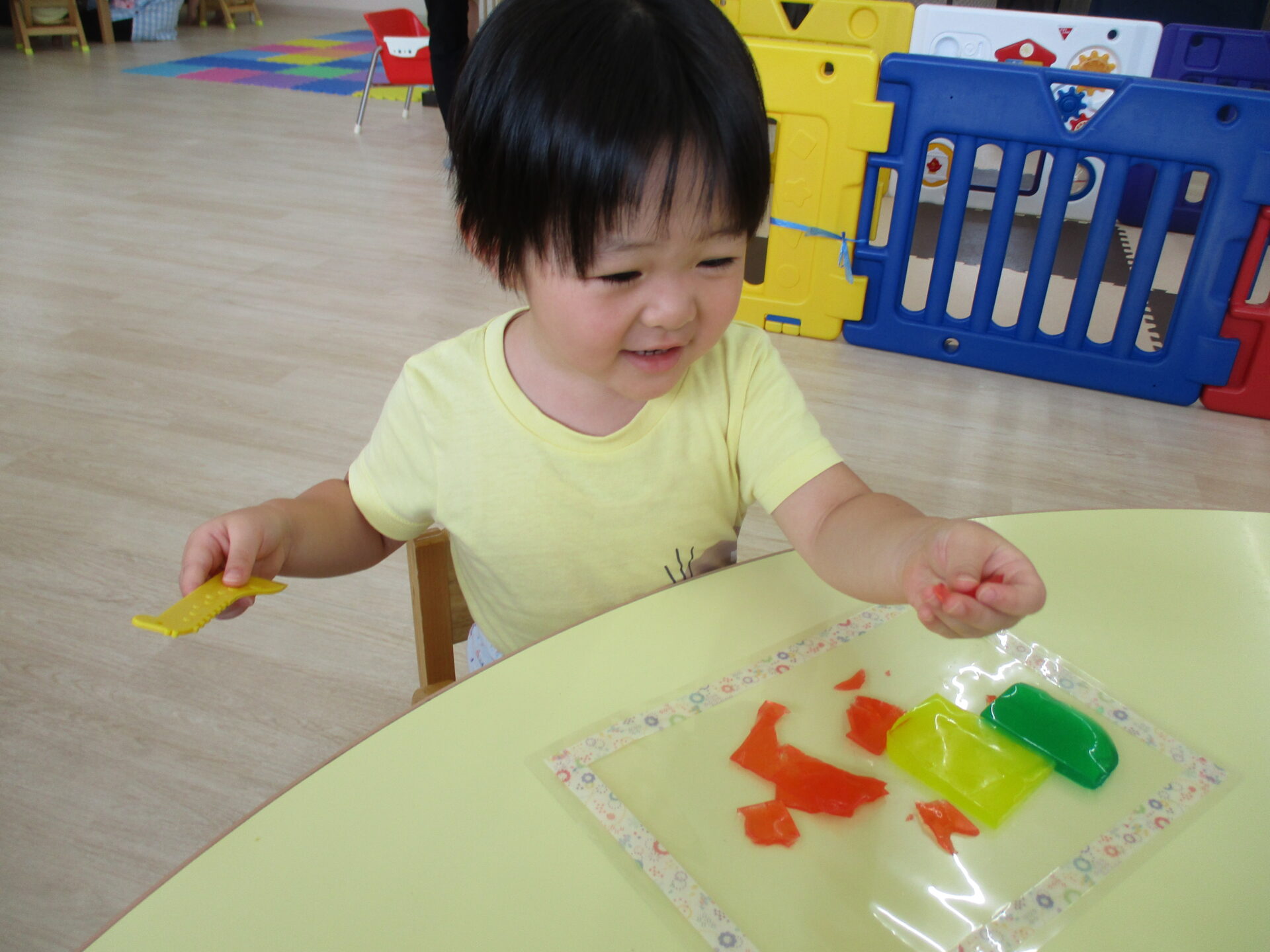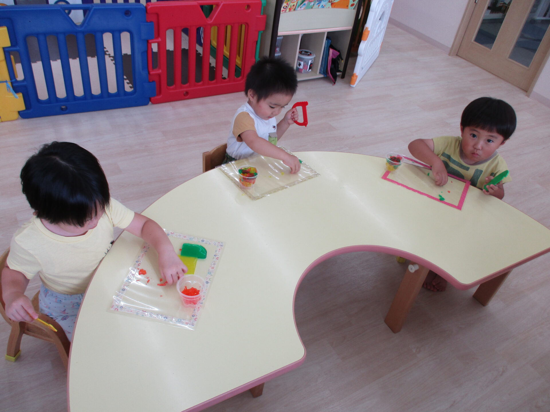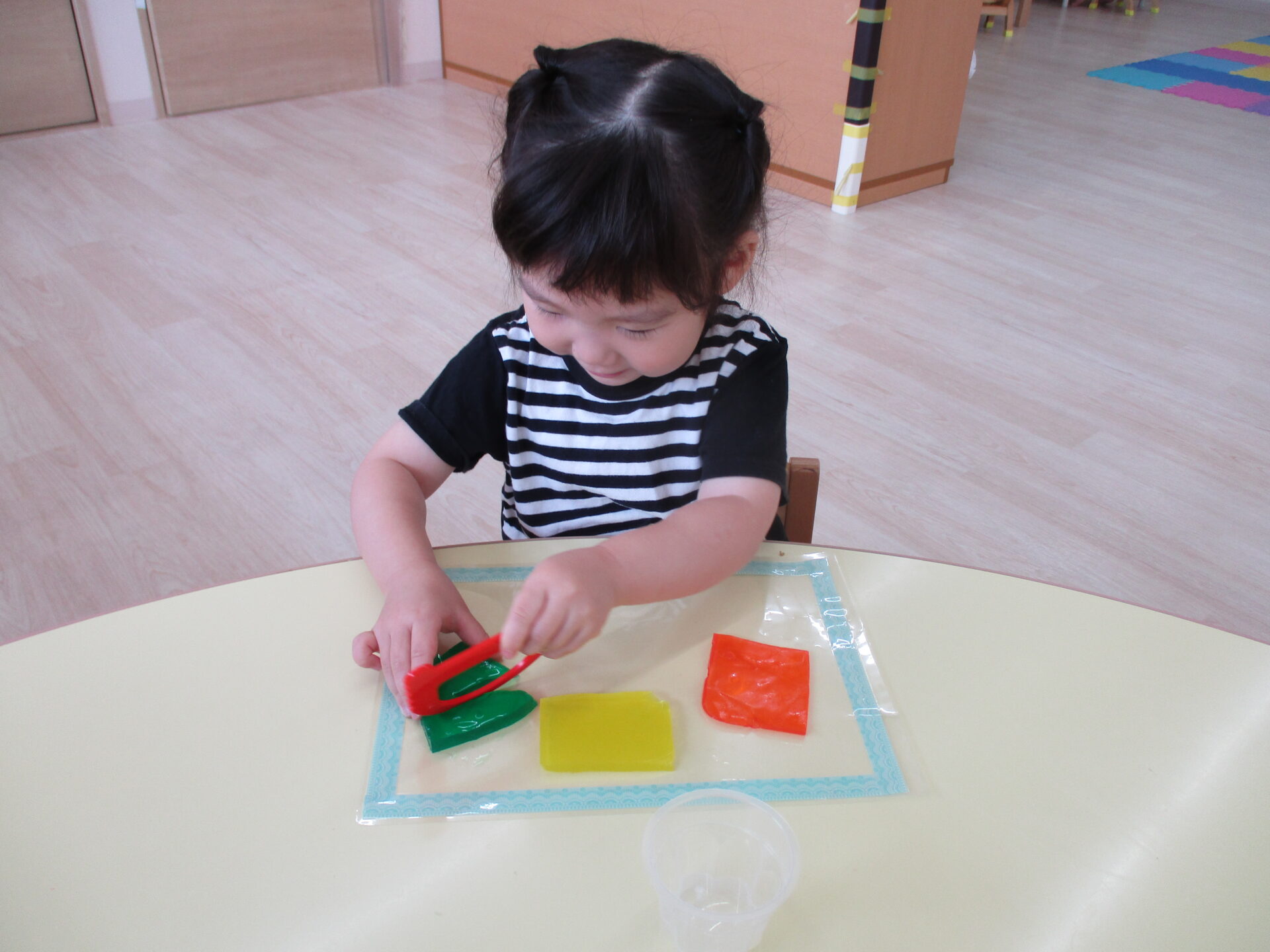きりん組(2歳児)のお友だちは、粘土ベラを使って、