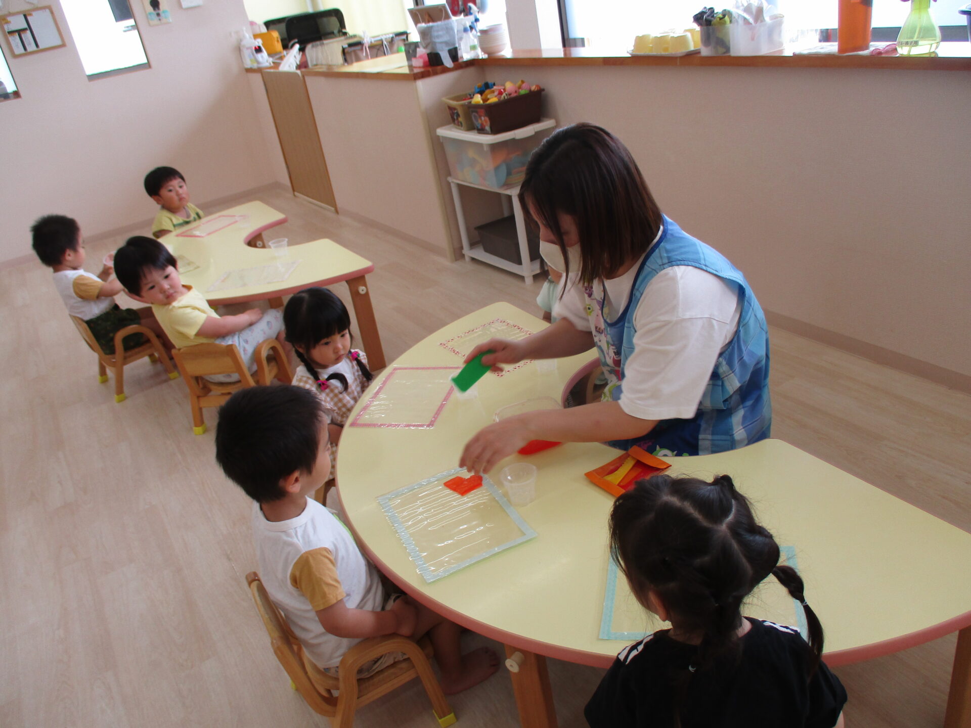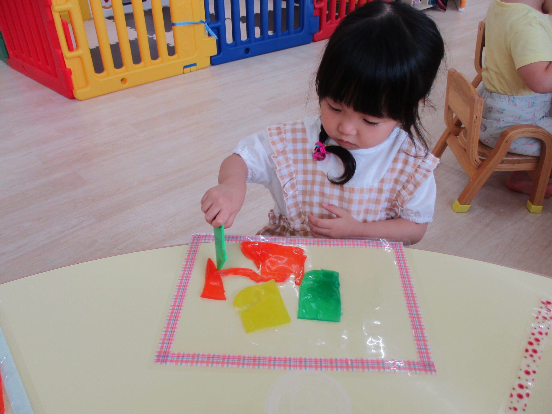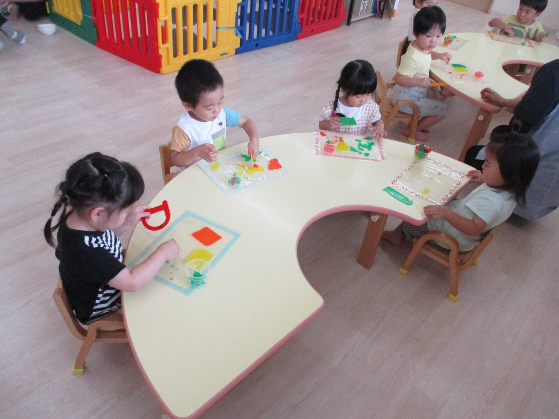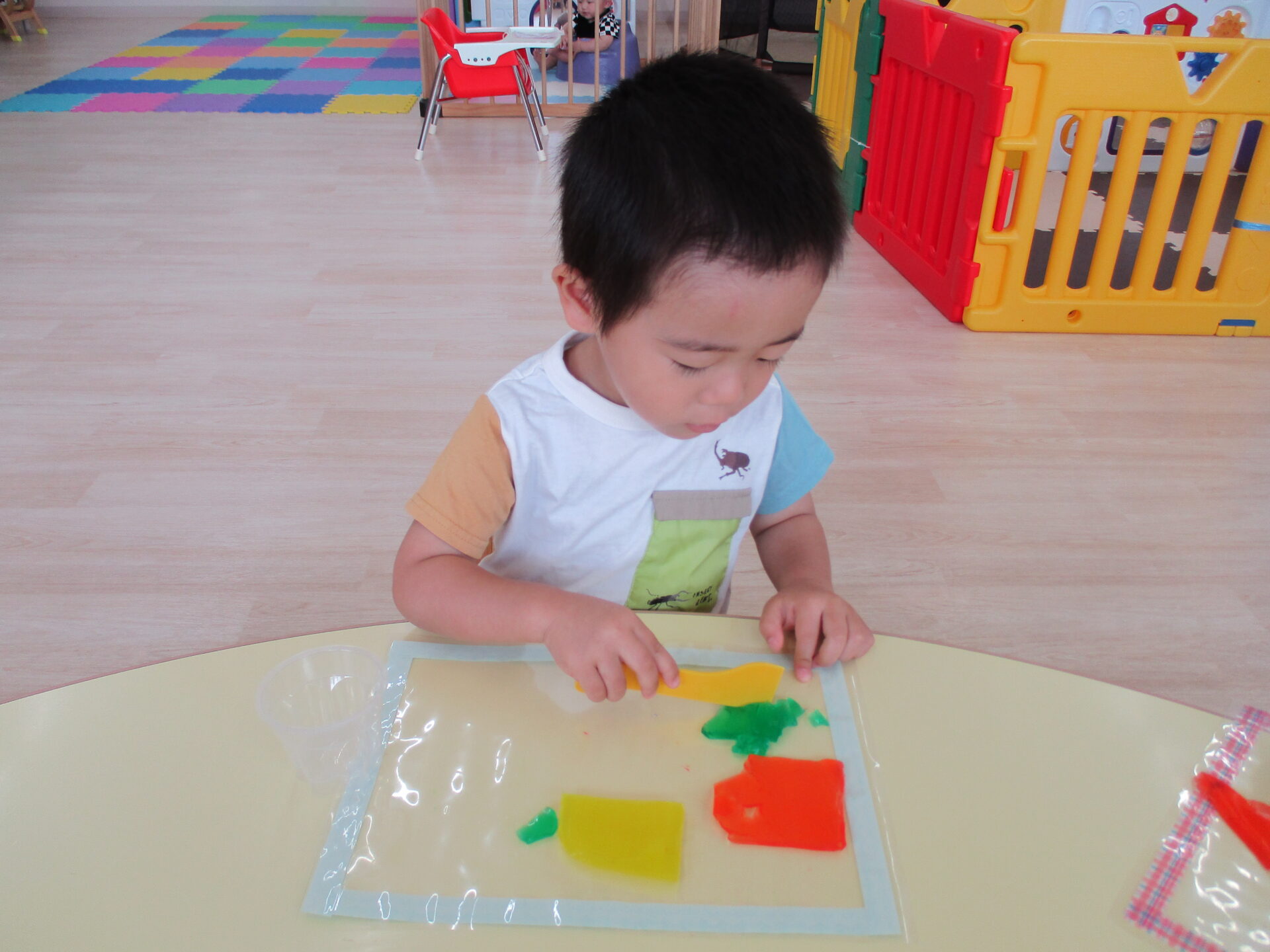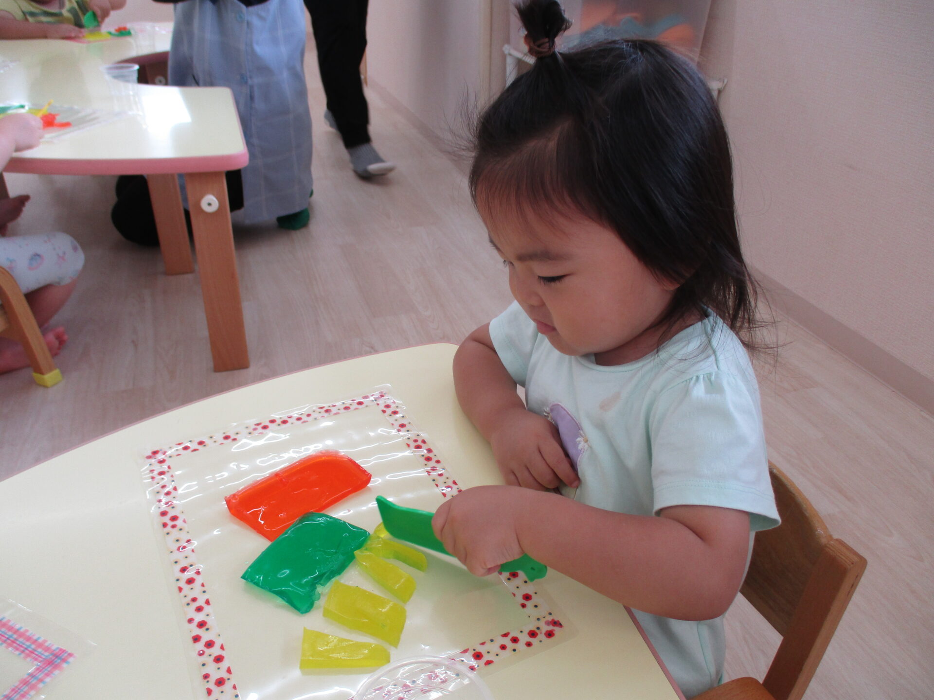 きりん組(2歳児)のお友だちは、粘土ベラを使って、
