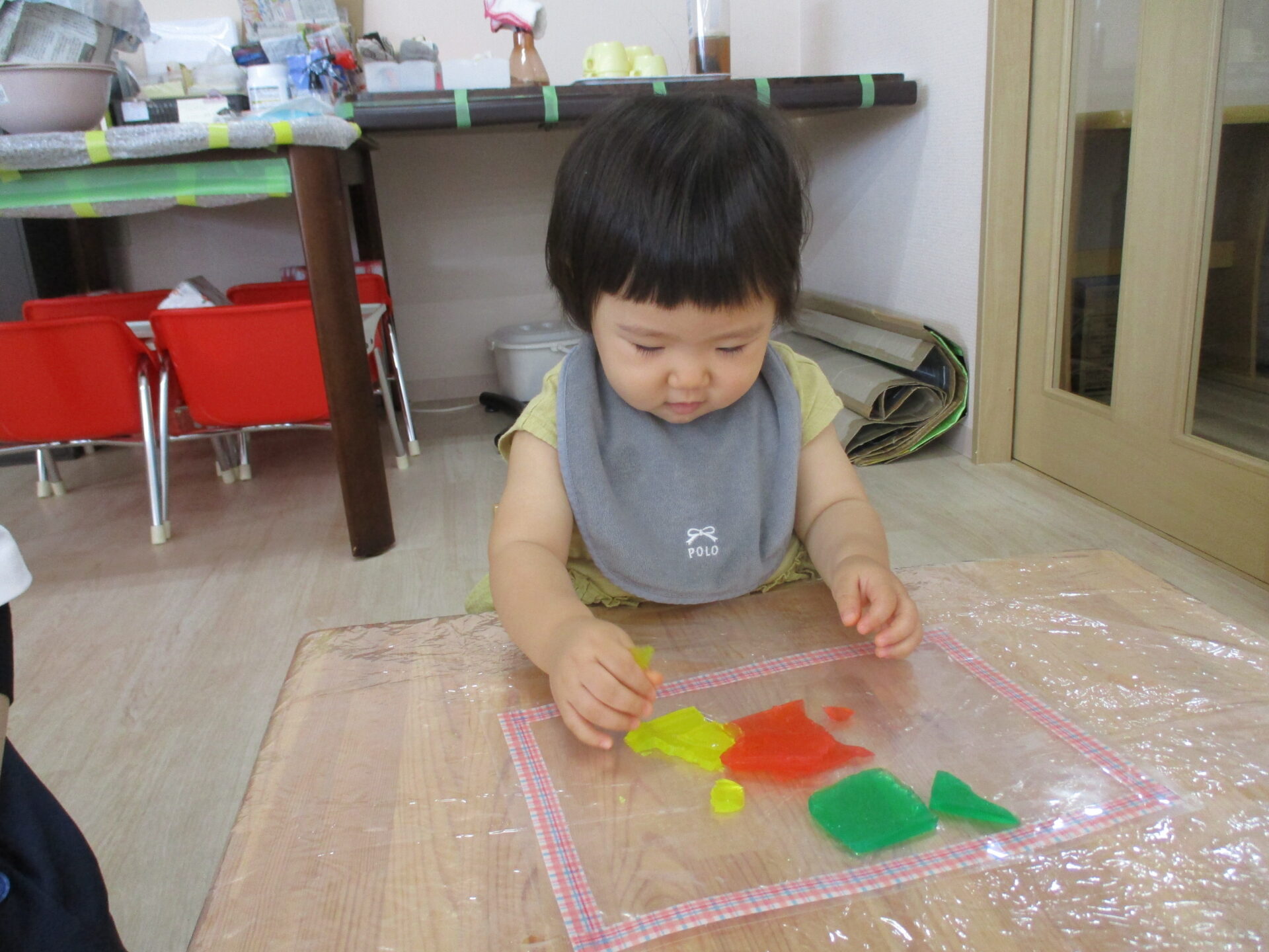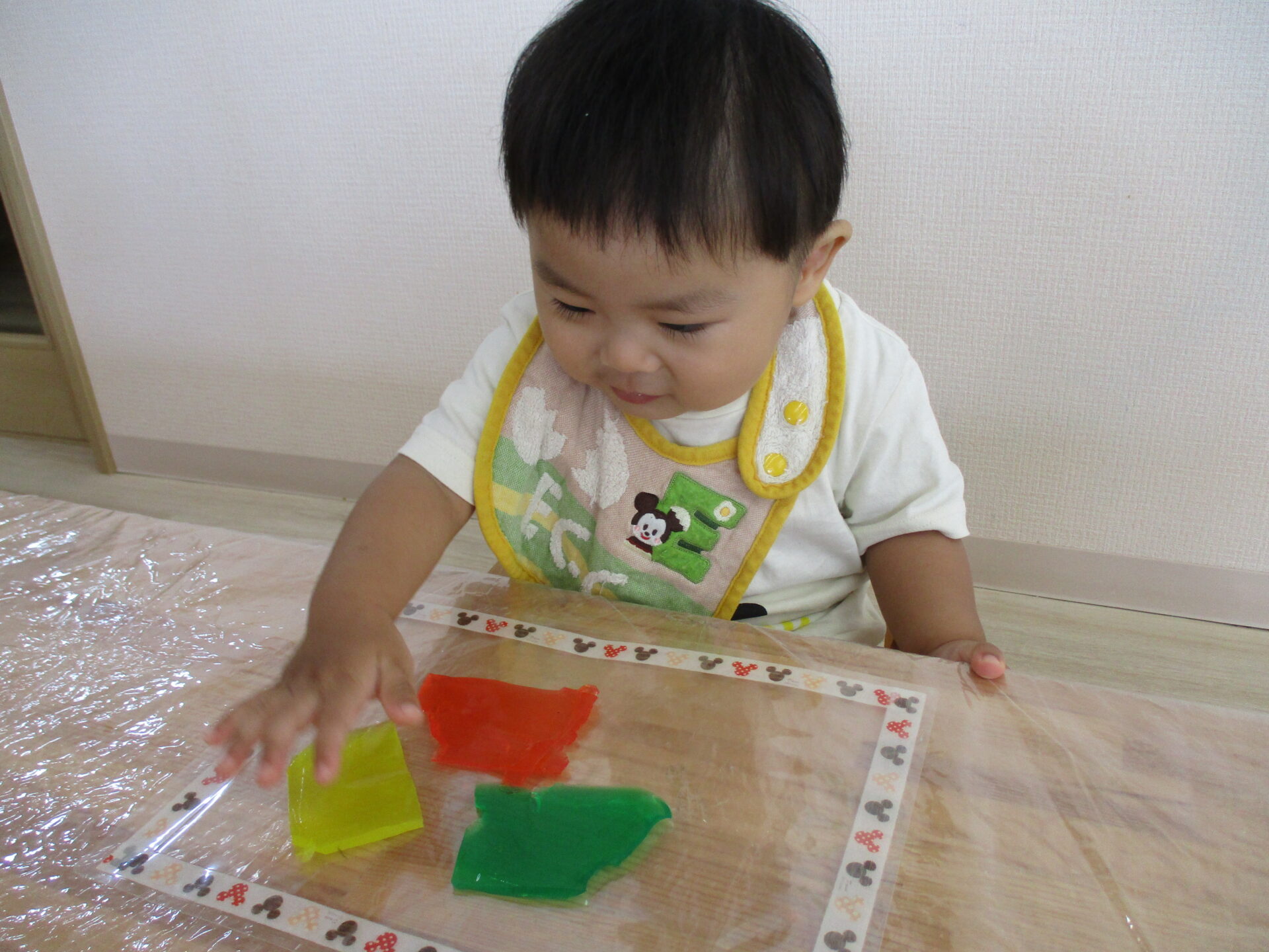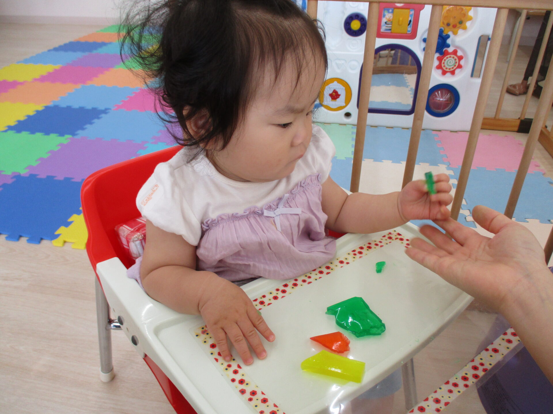 りす組(1歳児)のお友だちは、手で寒天の感触を楽しみます!
