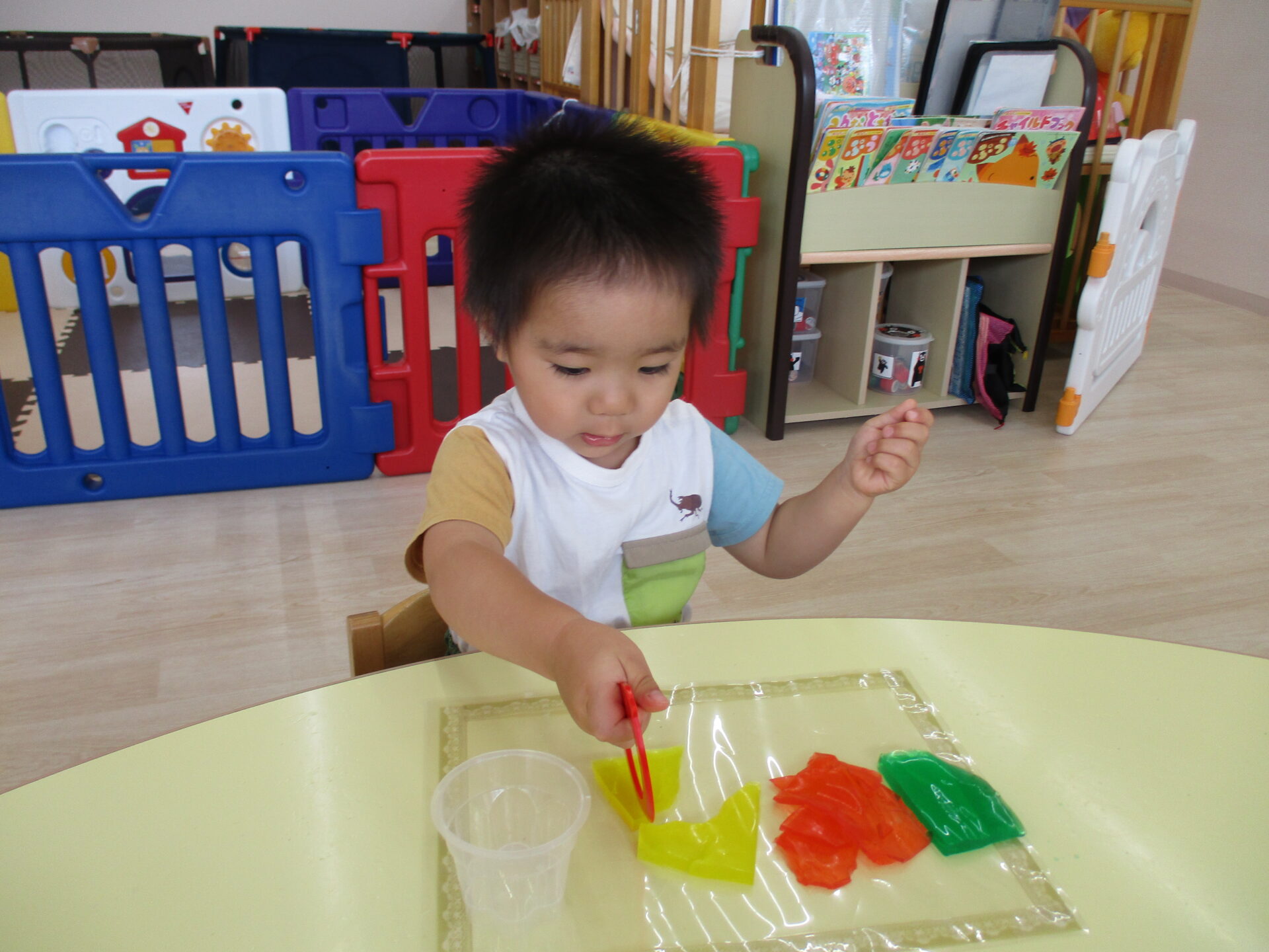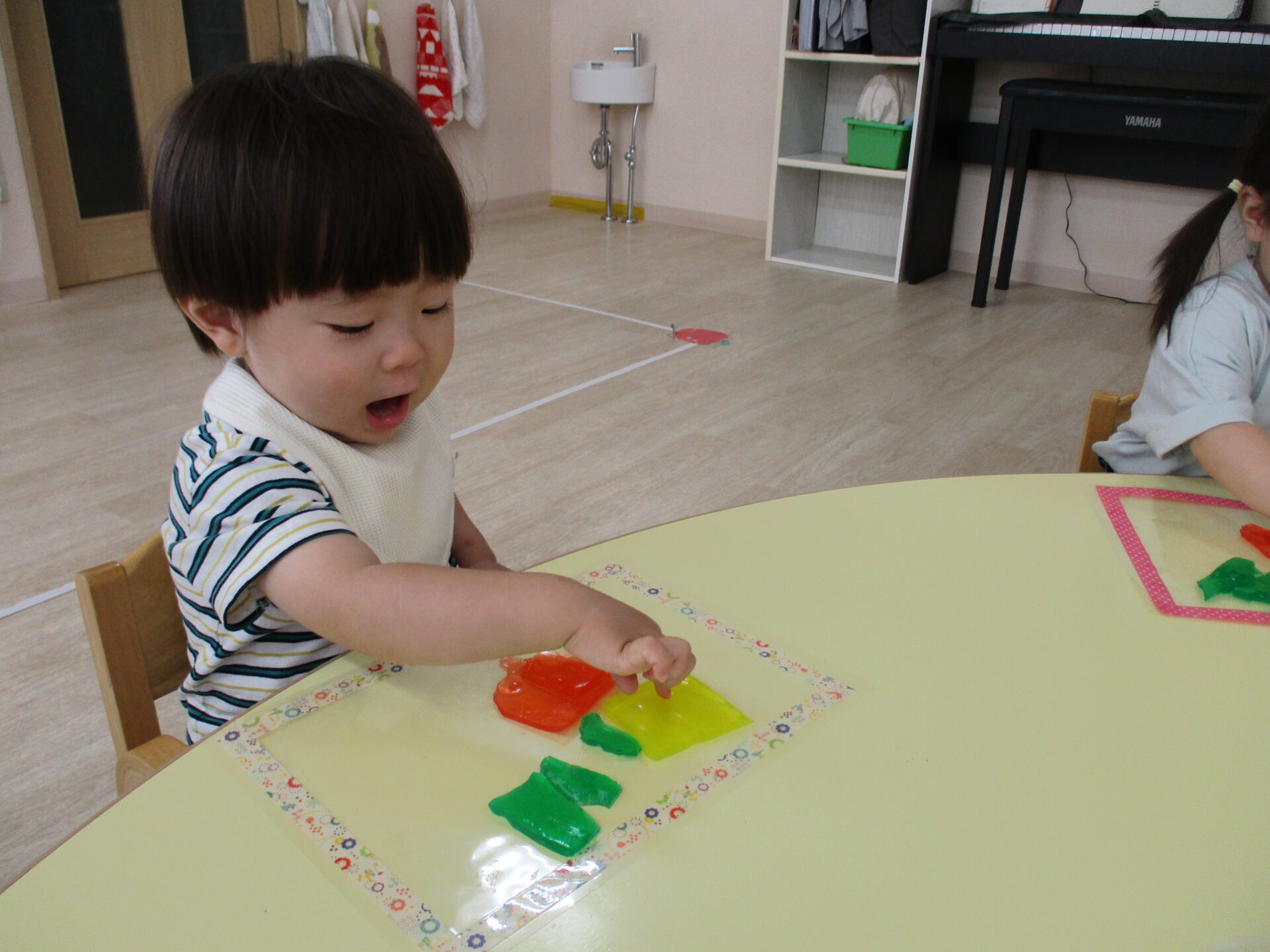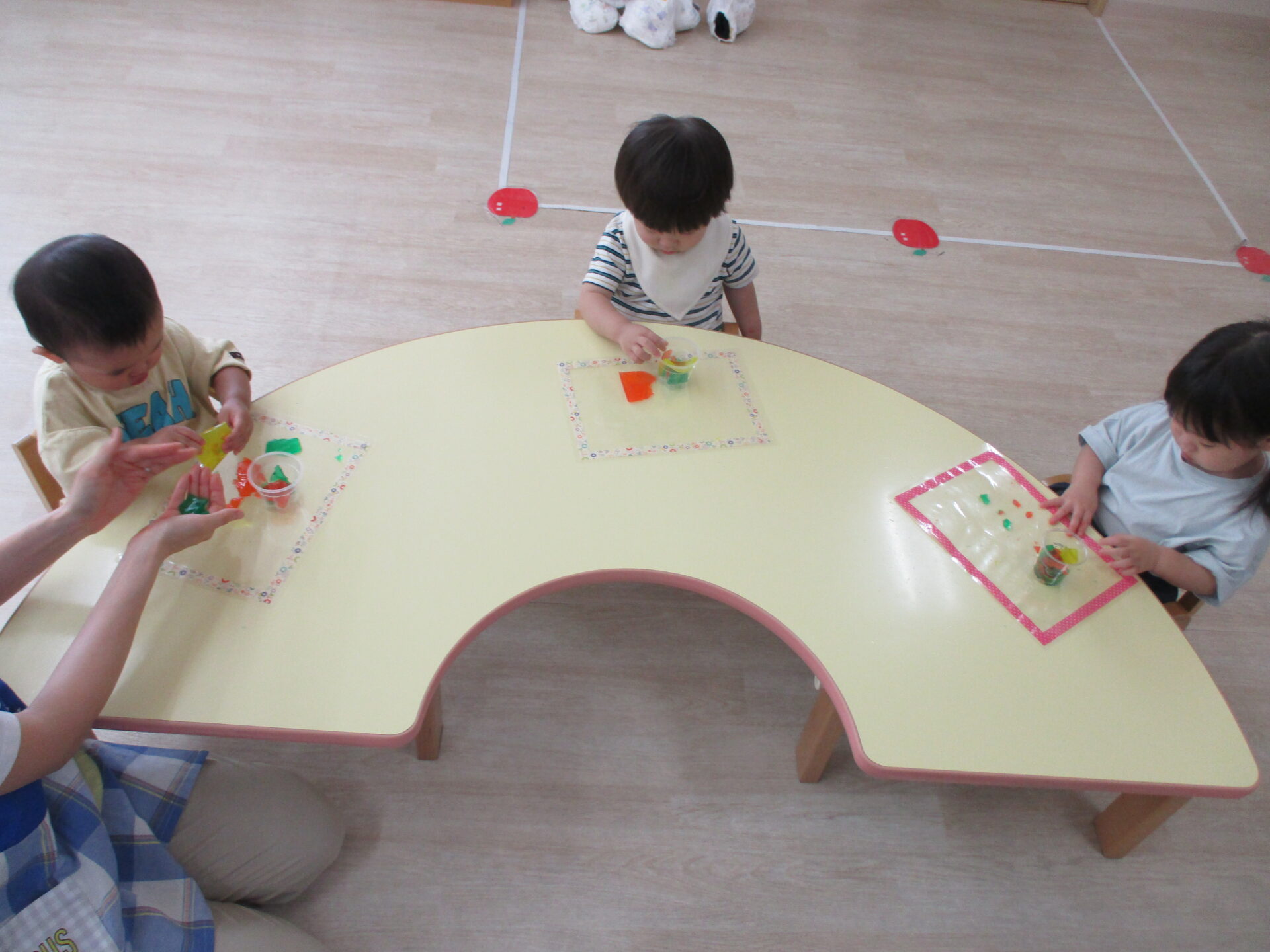りす組(1歳児)のお友だちは、手で寒天の感触を楽しみます!