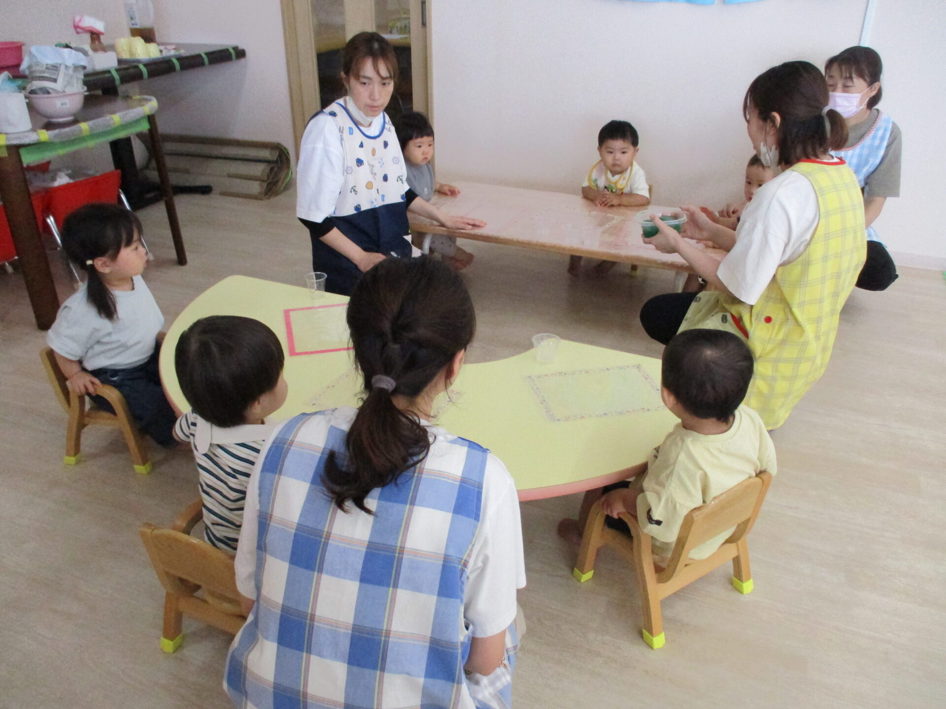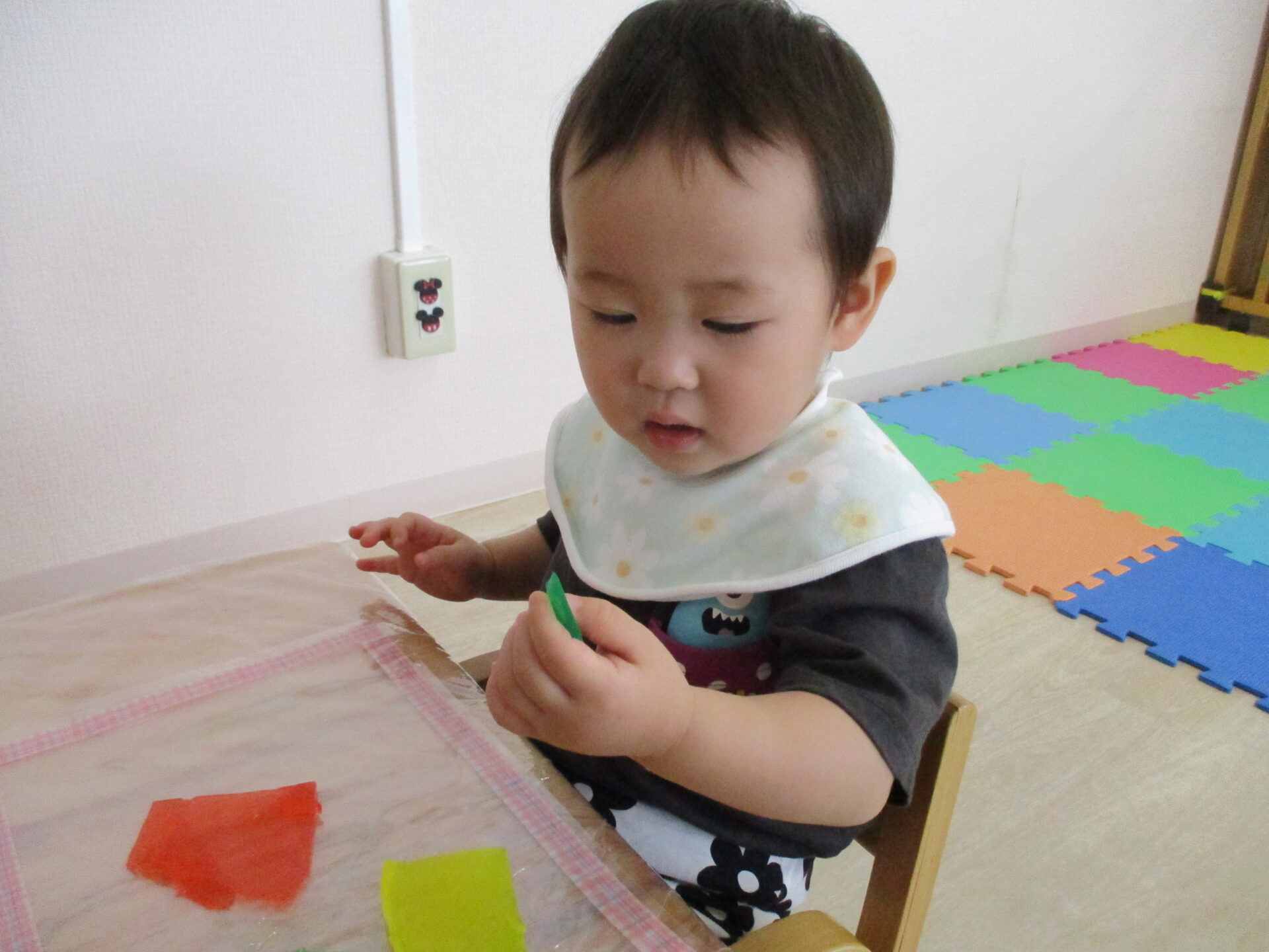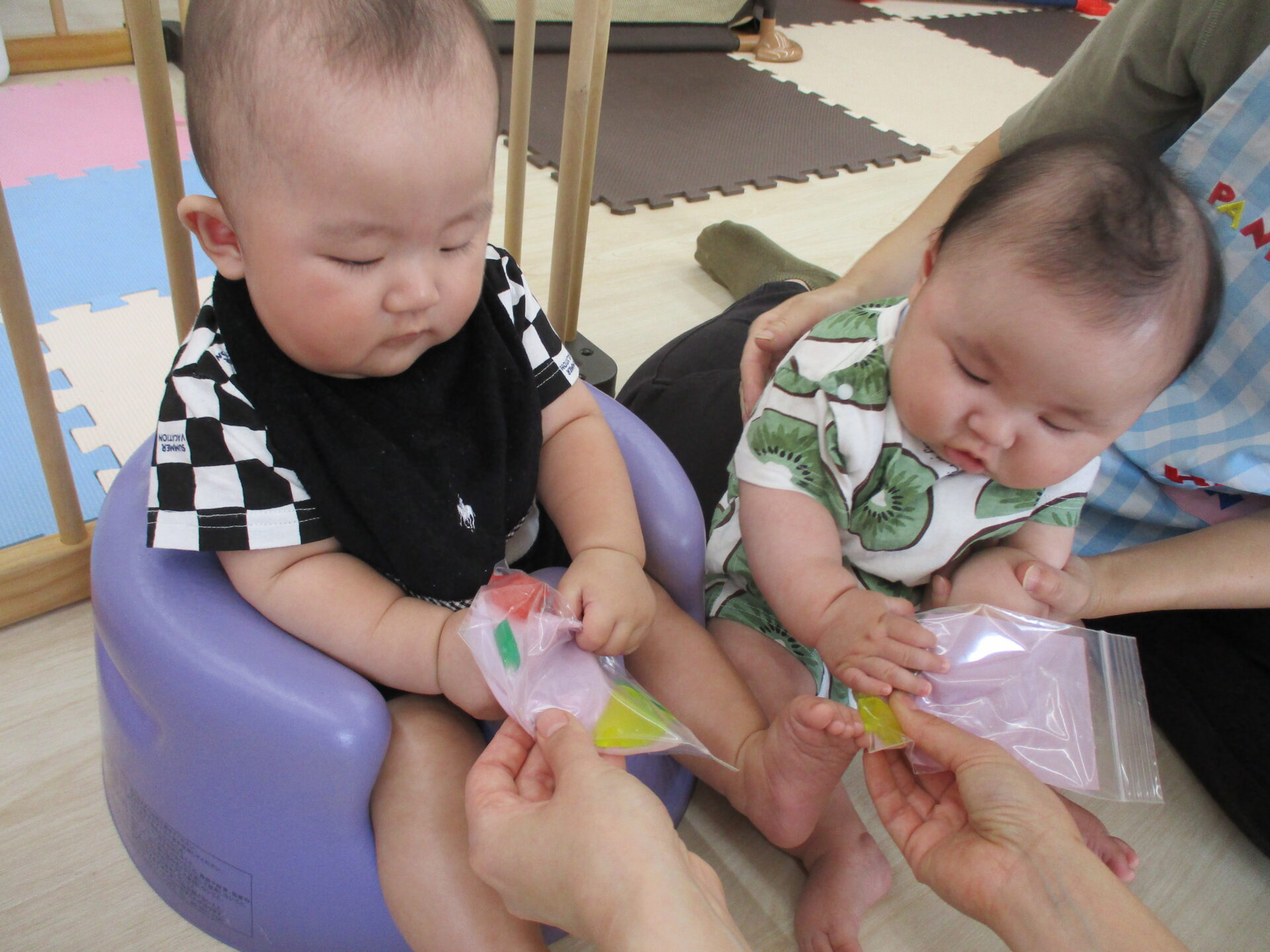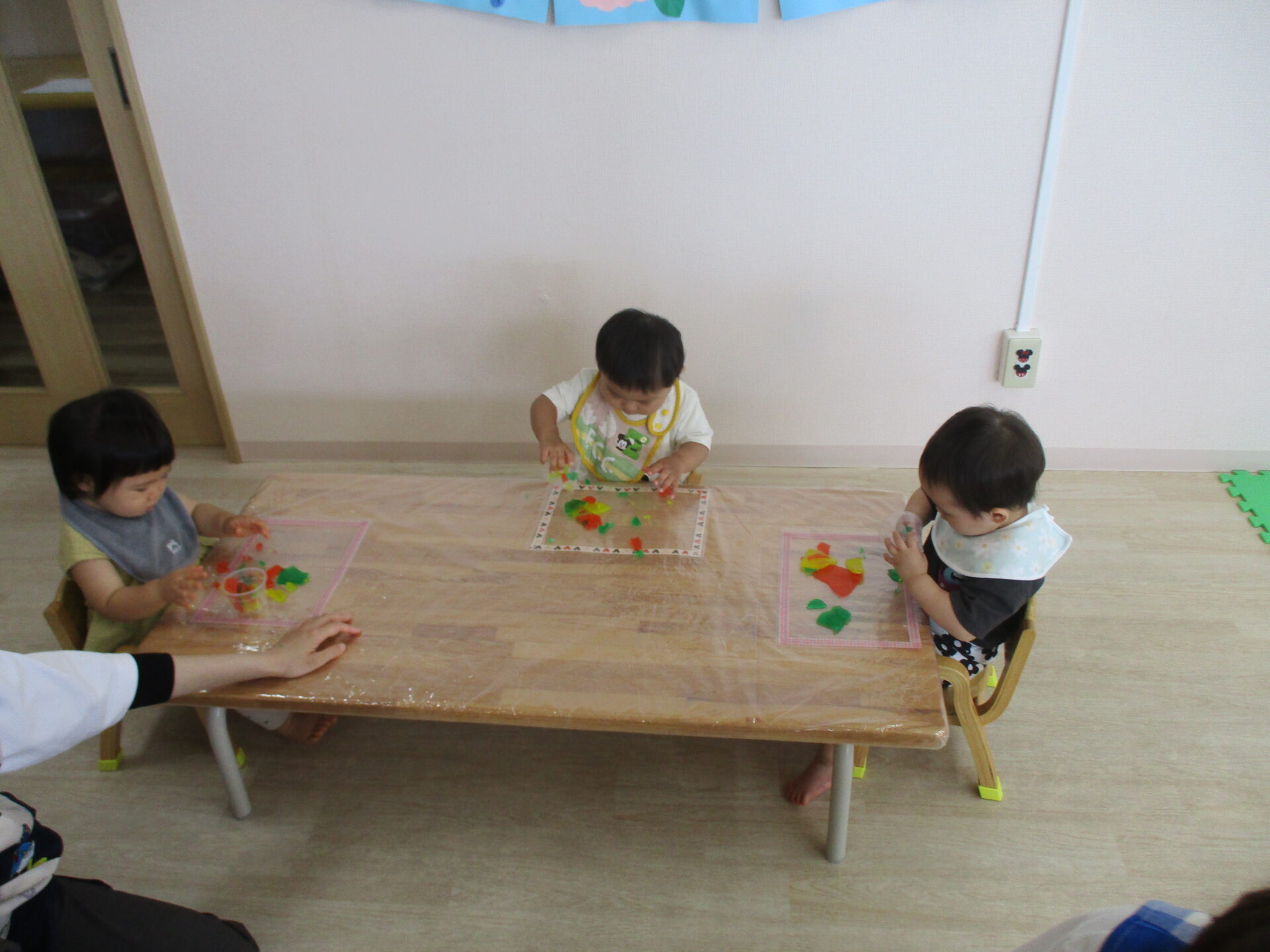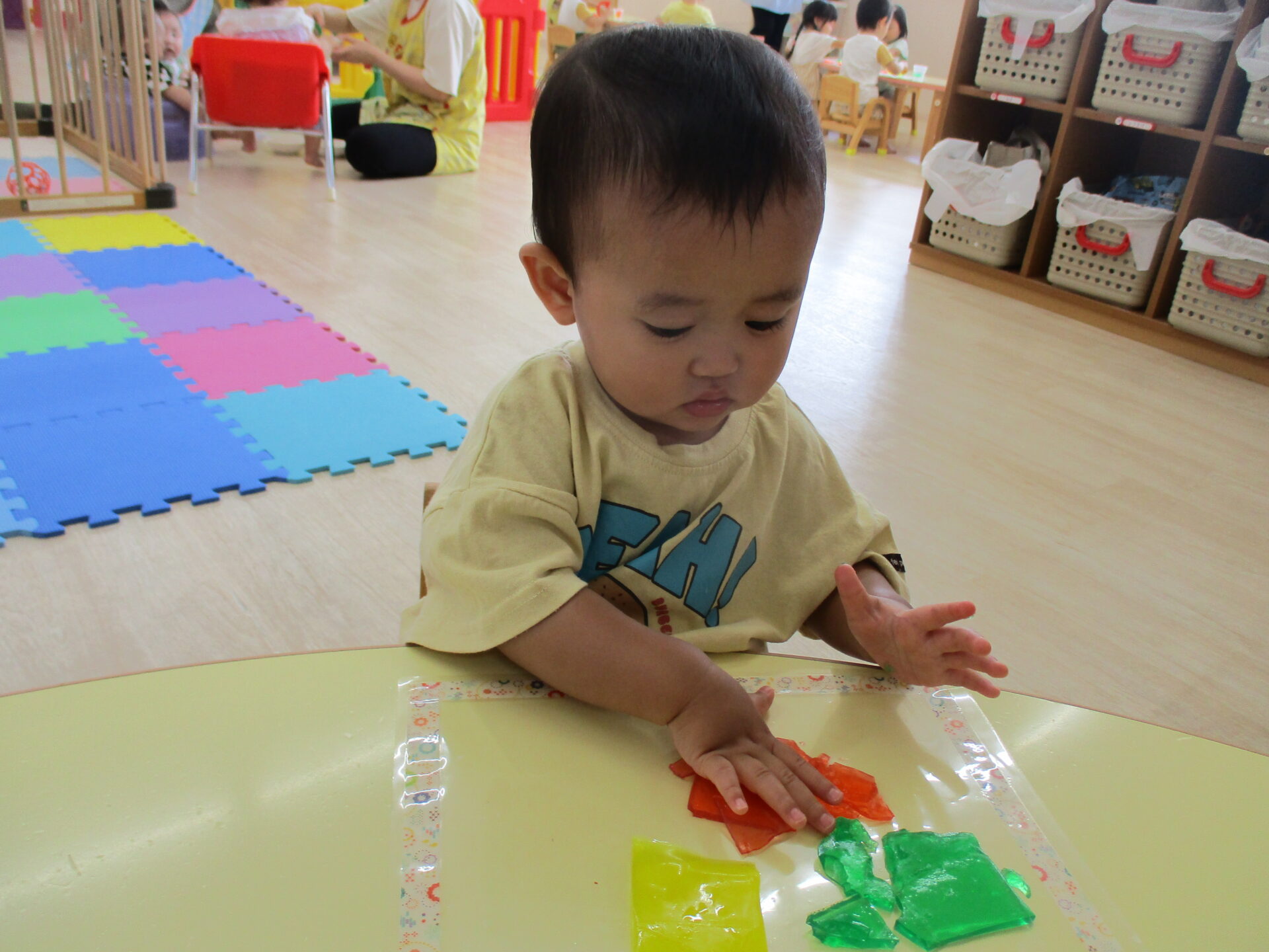 ひよこ組(0歳児)のお友だちは、手で感触を楽しんだり