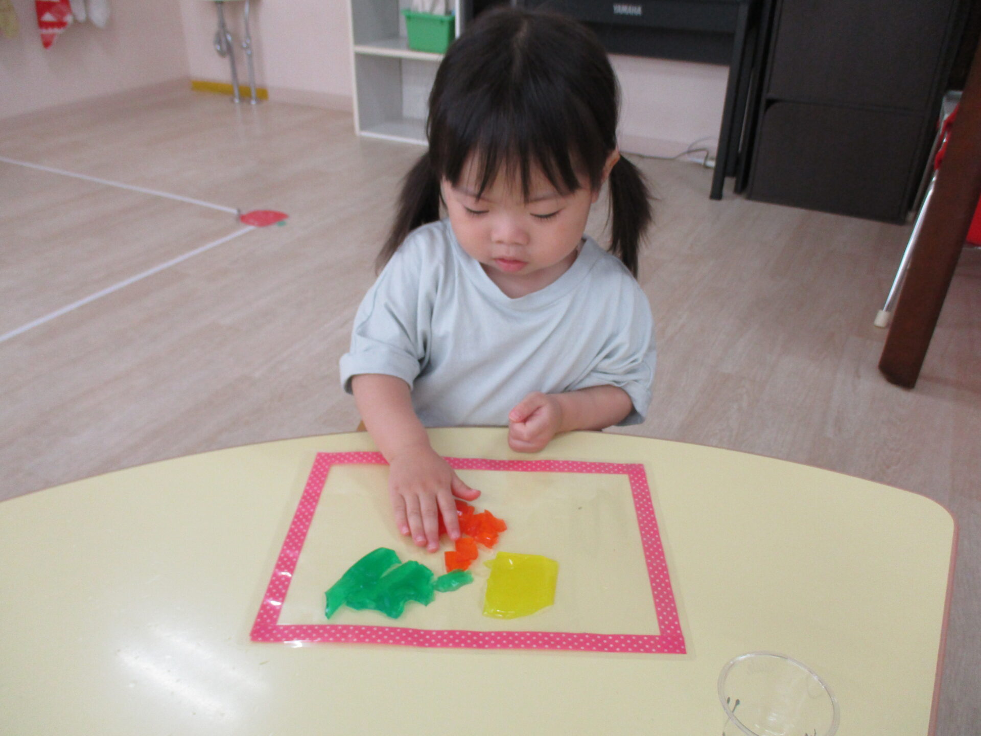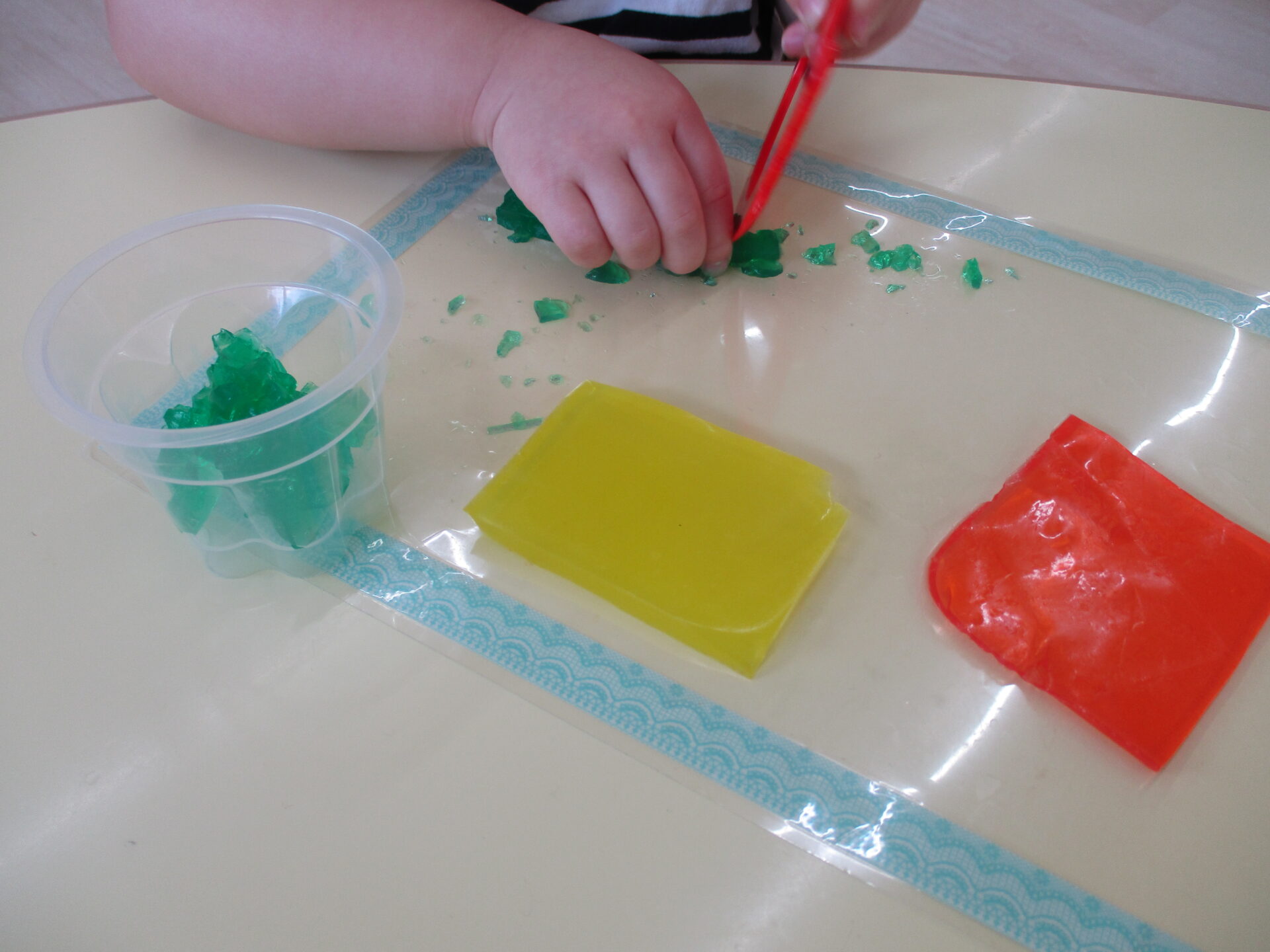 3色の寒天をもらったら早速遊んでみます!