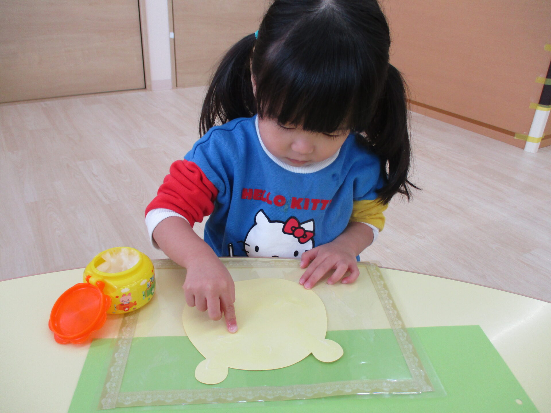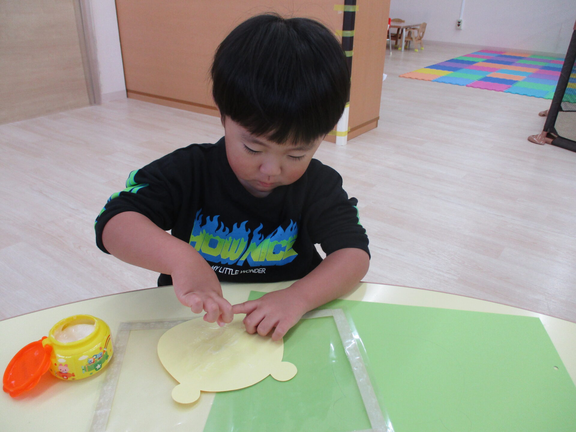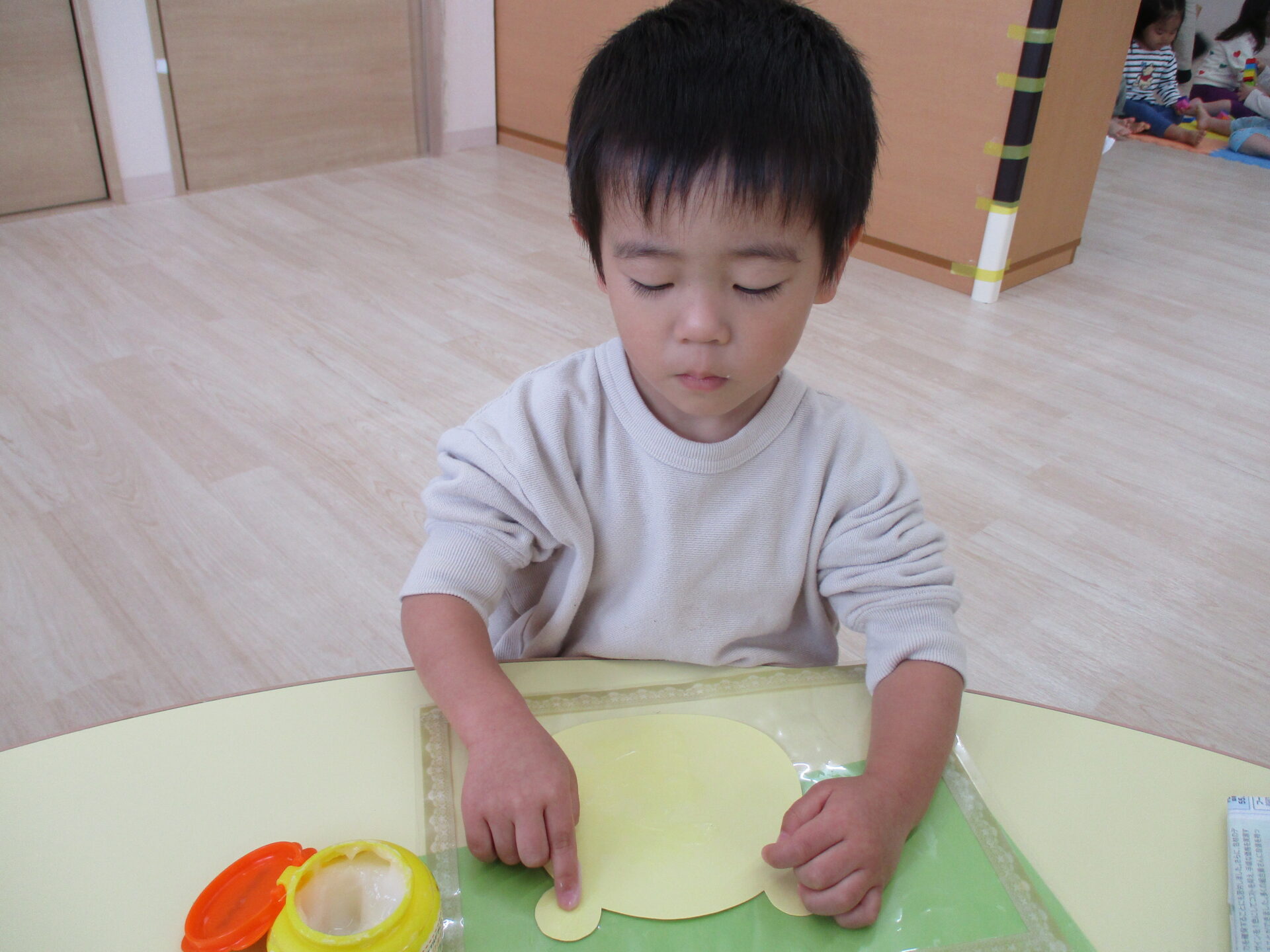 広範囲に糊付けをするのはとても大変ですが、子ども達は糊を取って頑張って塗り広げていきます。