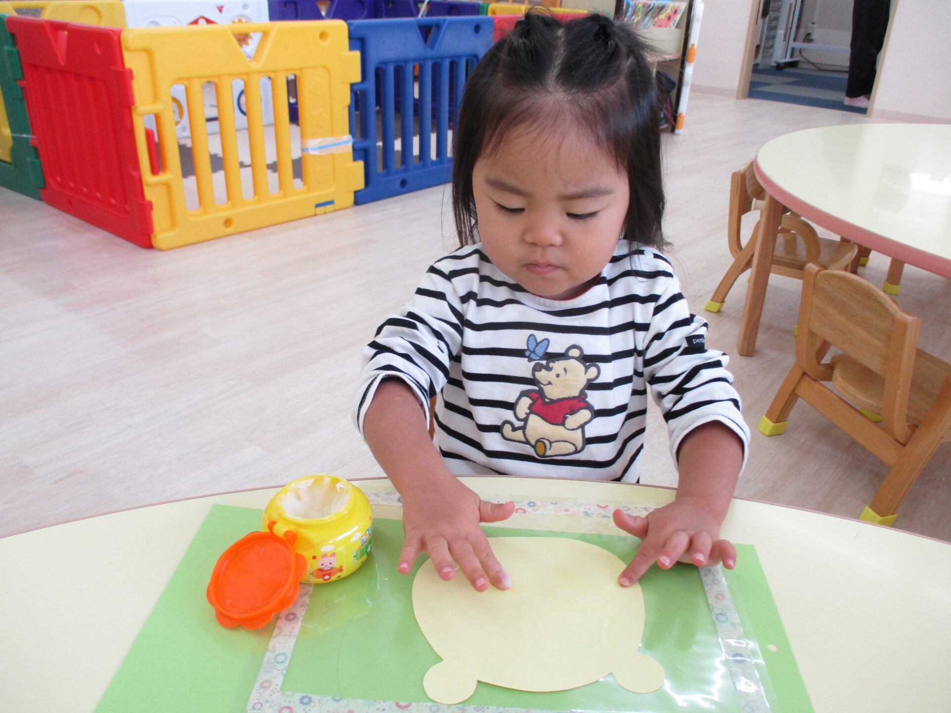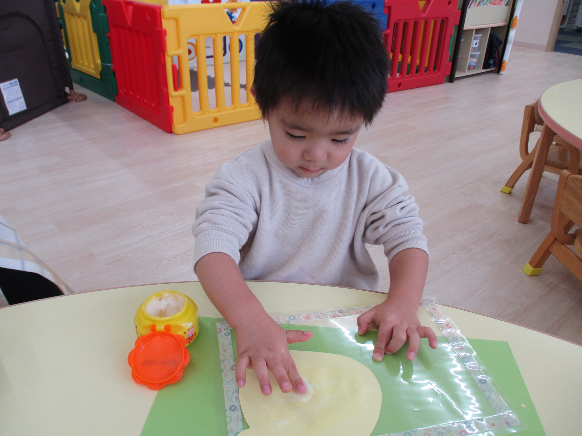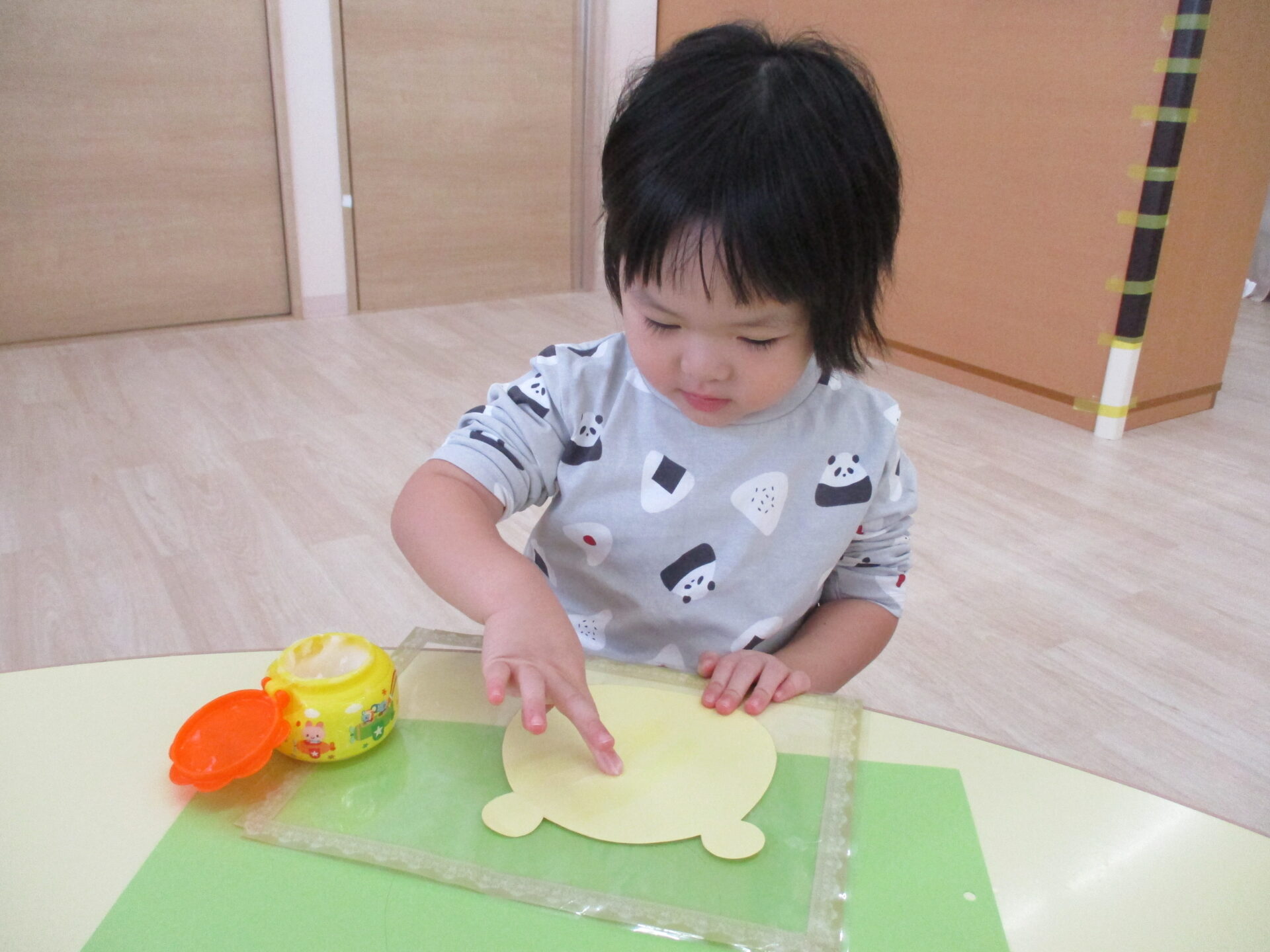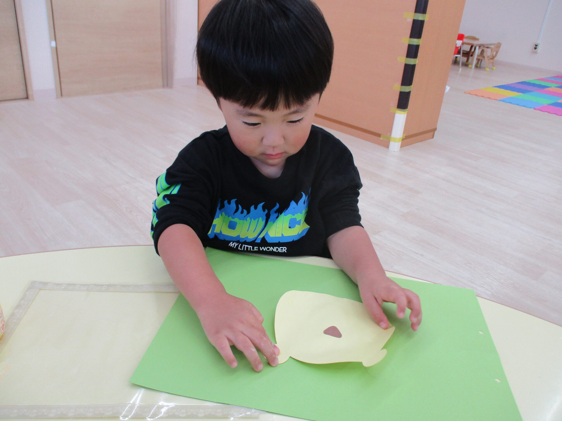 広範囲に糊付けをするのはとても大変ですが、子ども達は糊を取って頑張って塗り広げていきます。