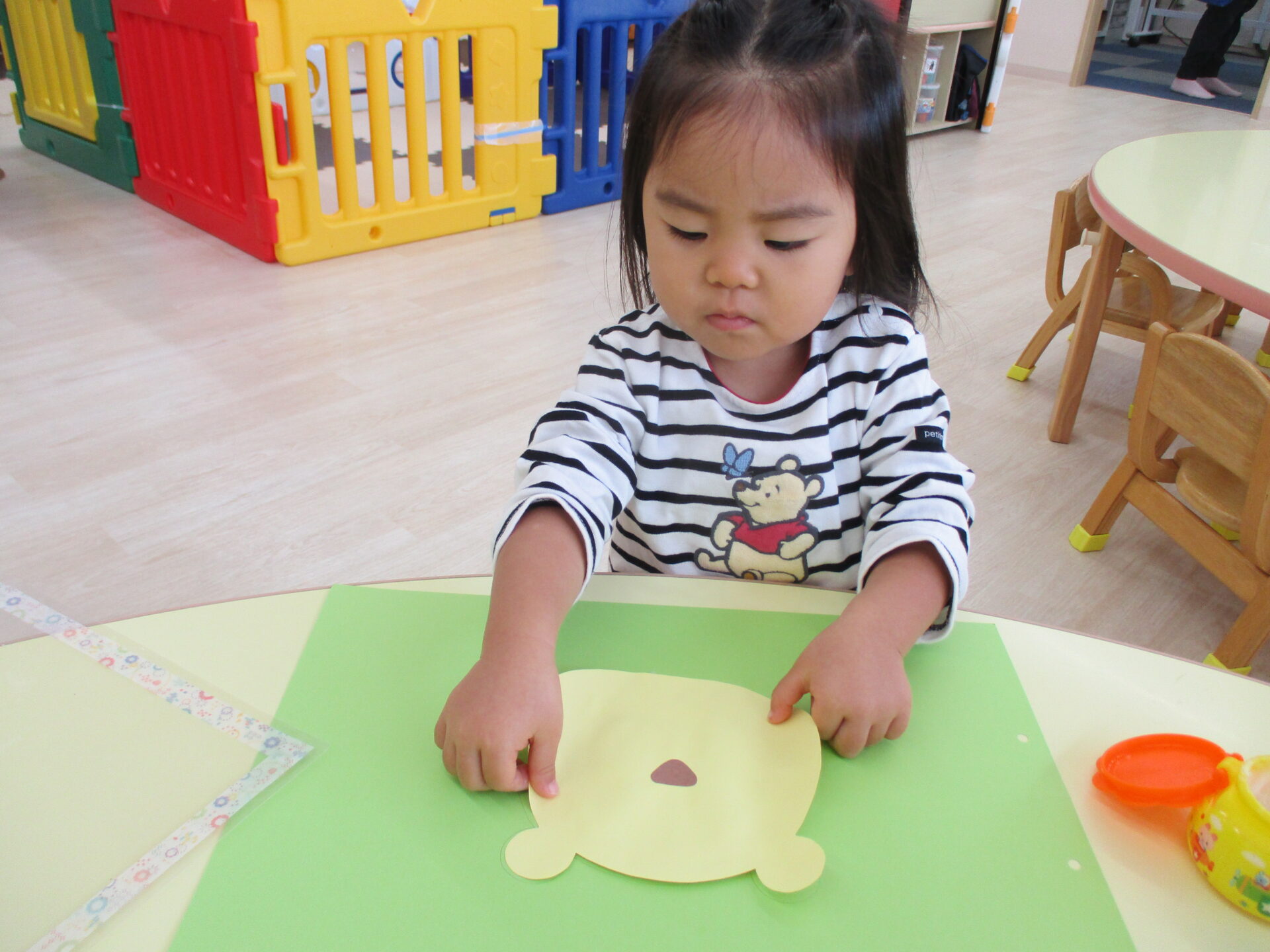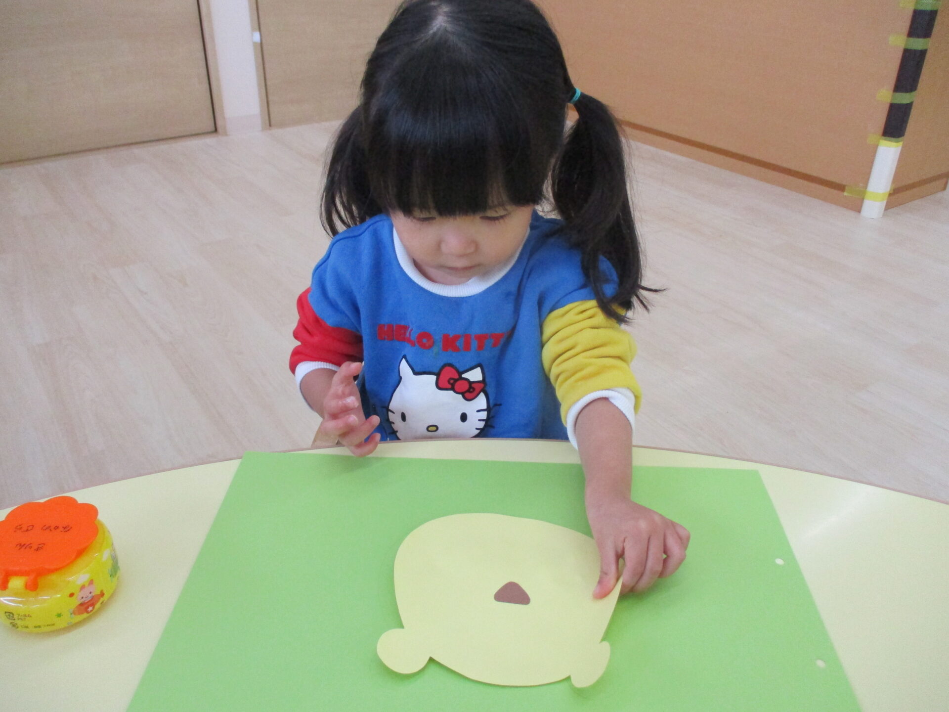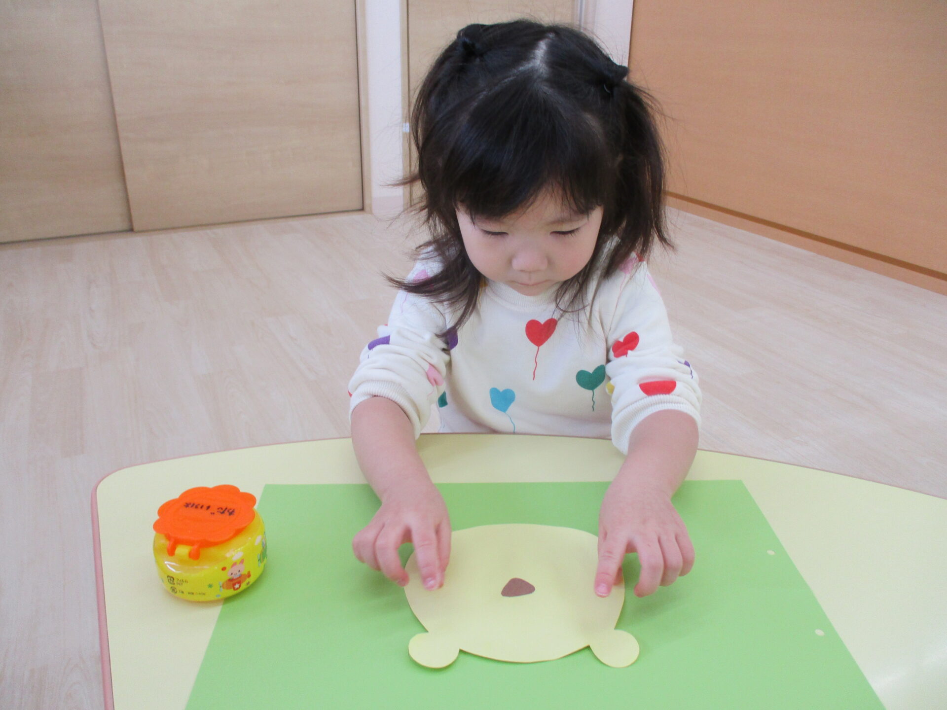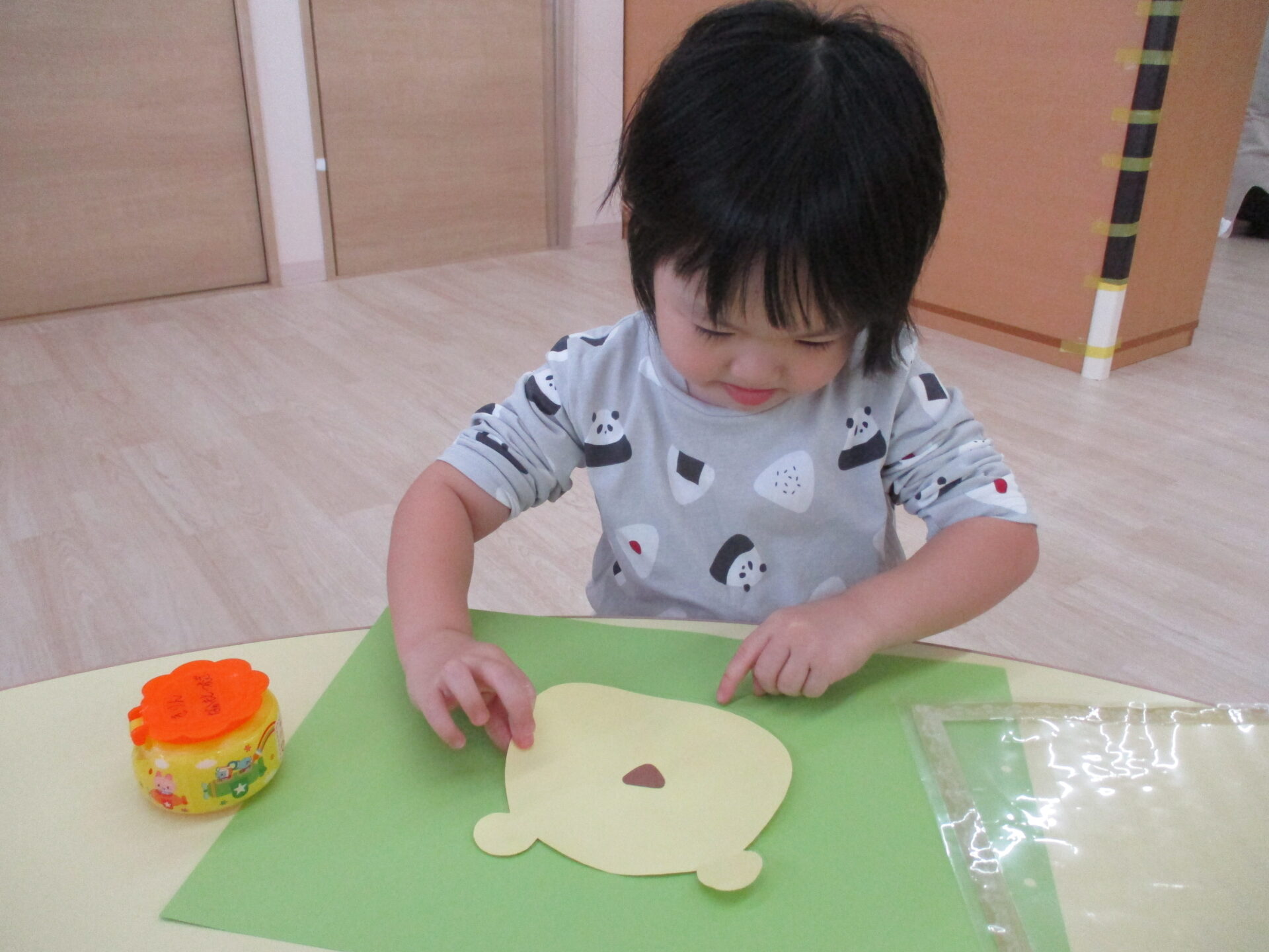目と口の位置を先生と一緒に確認しながら描きます☺