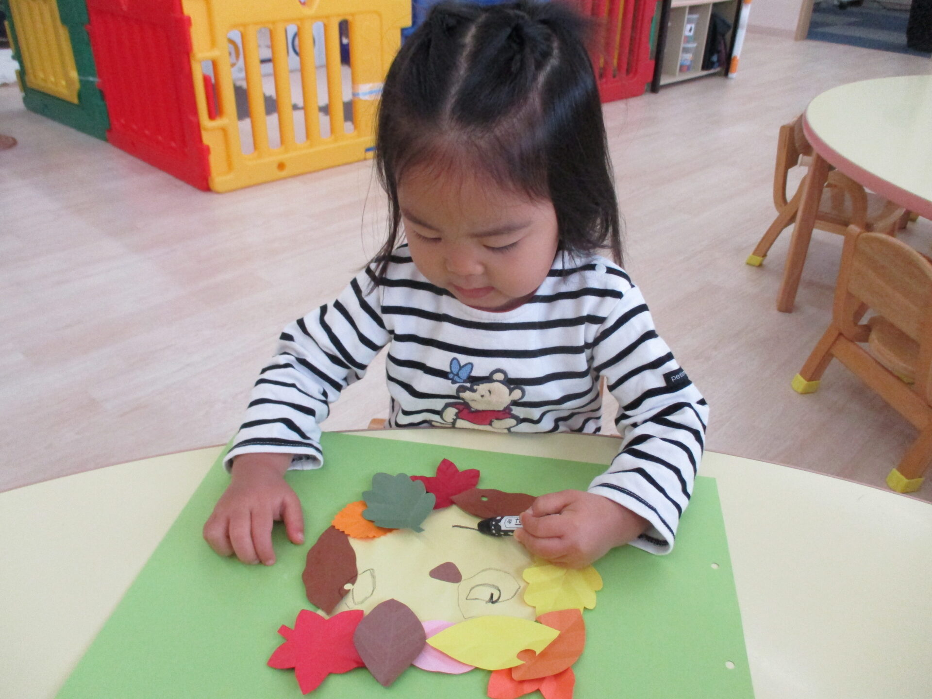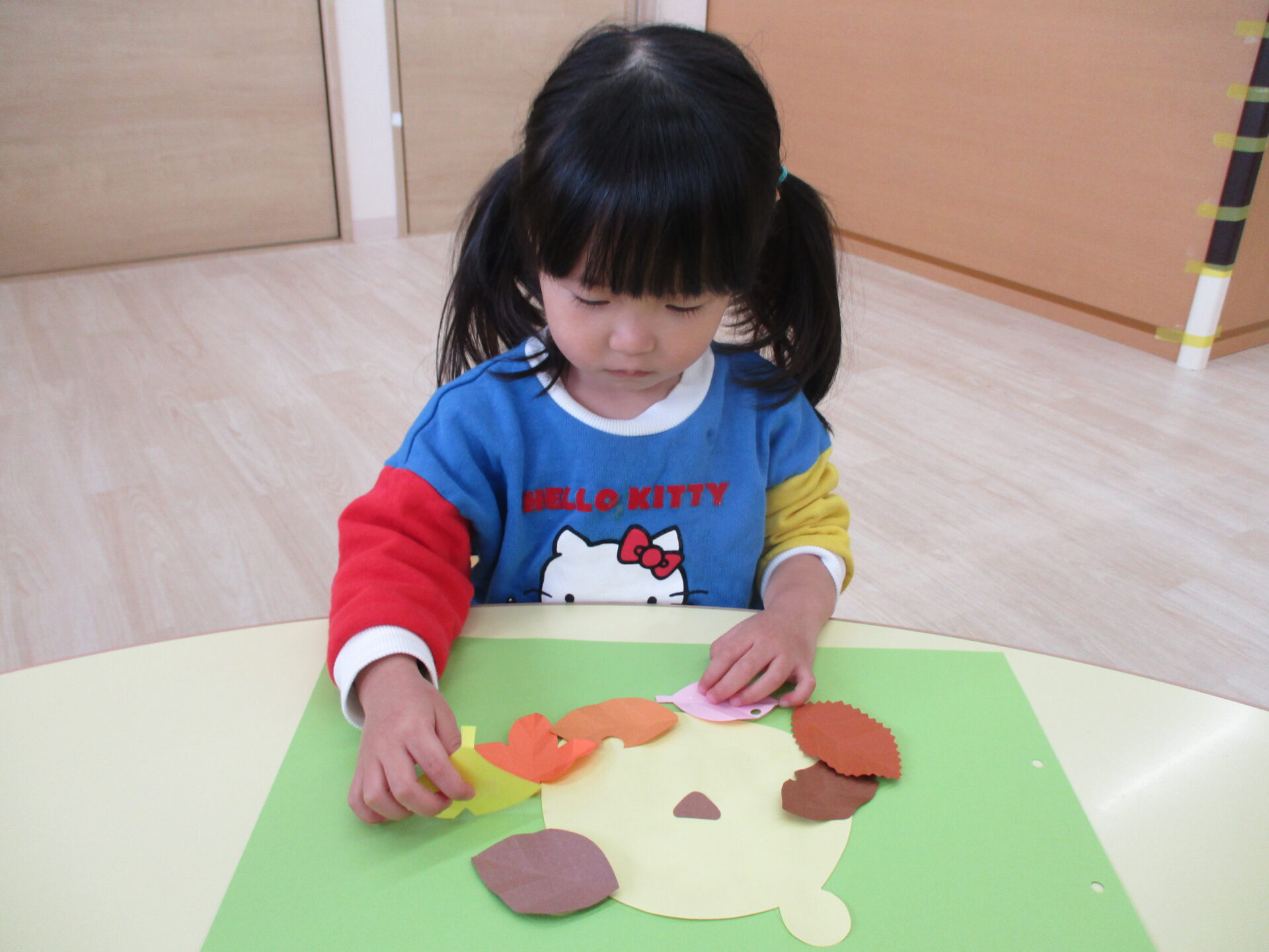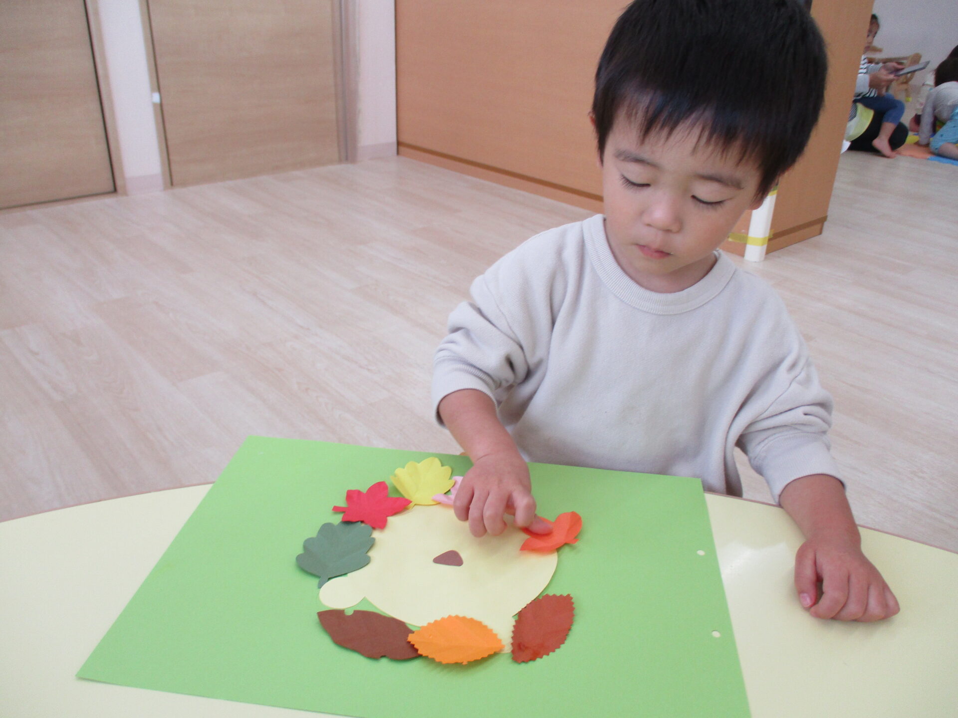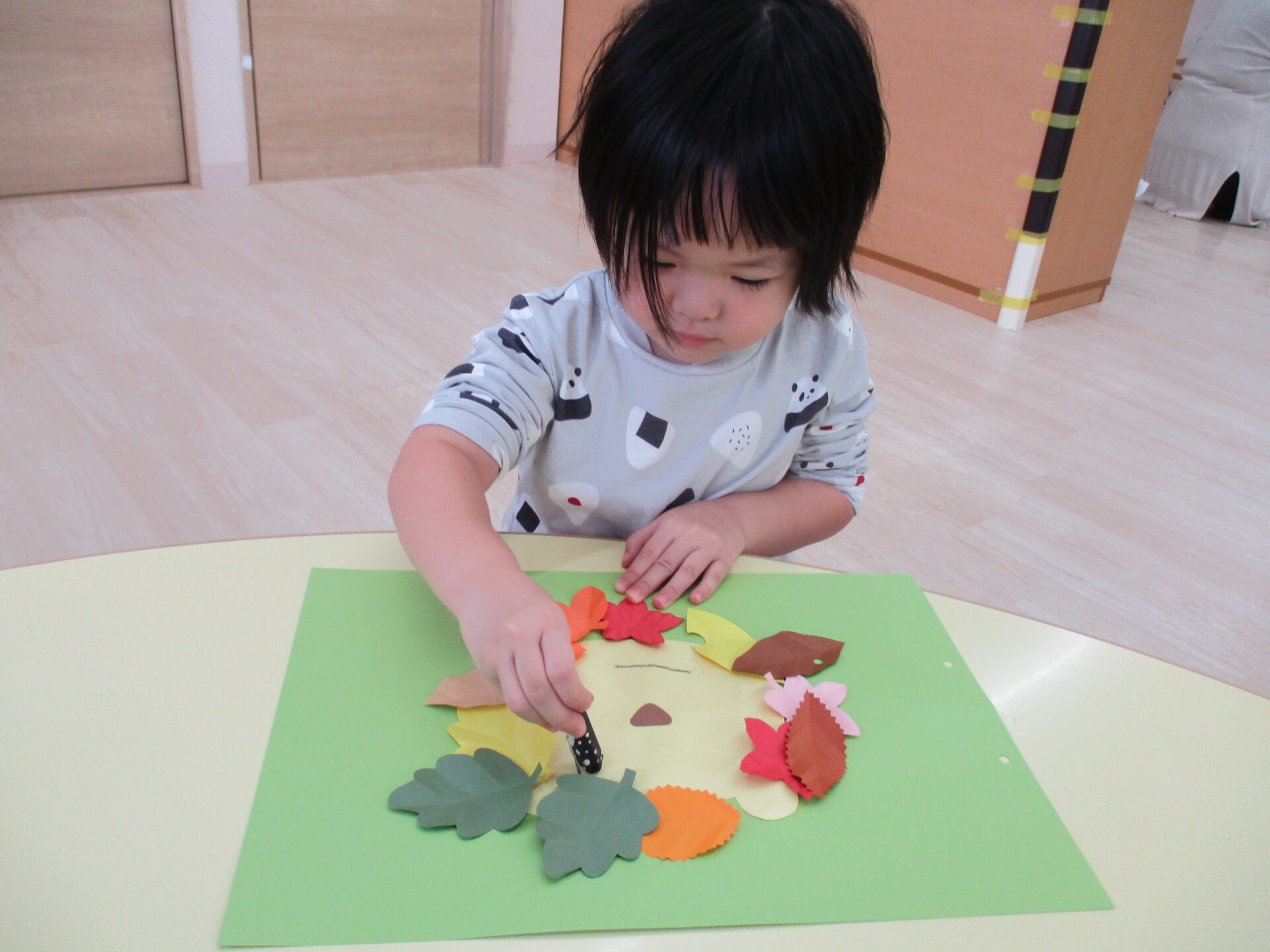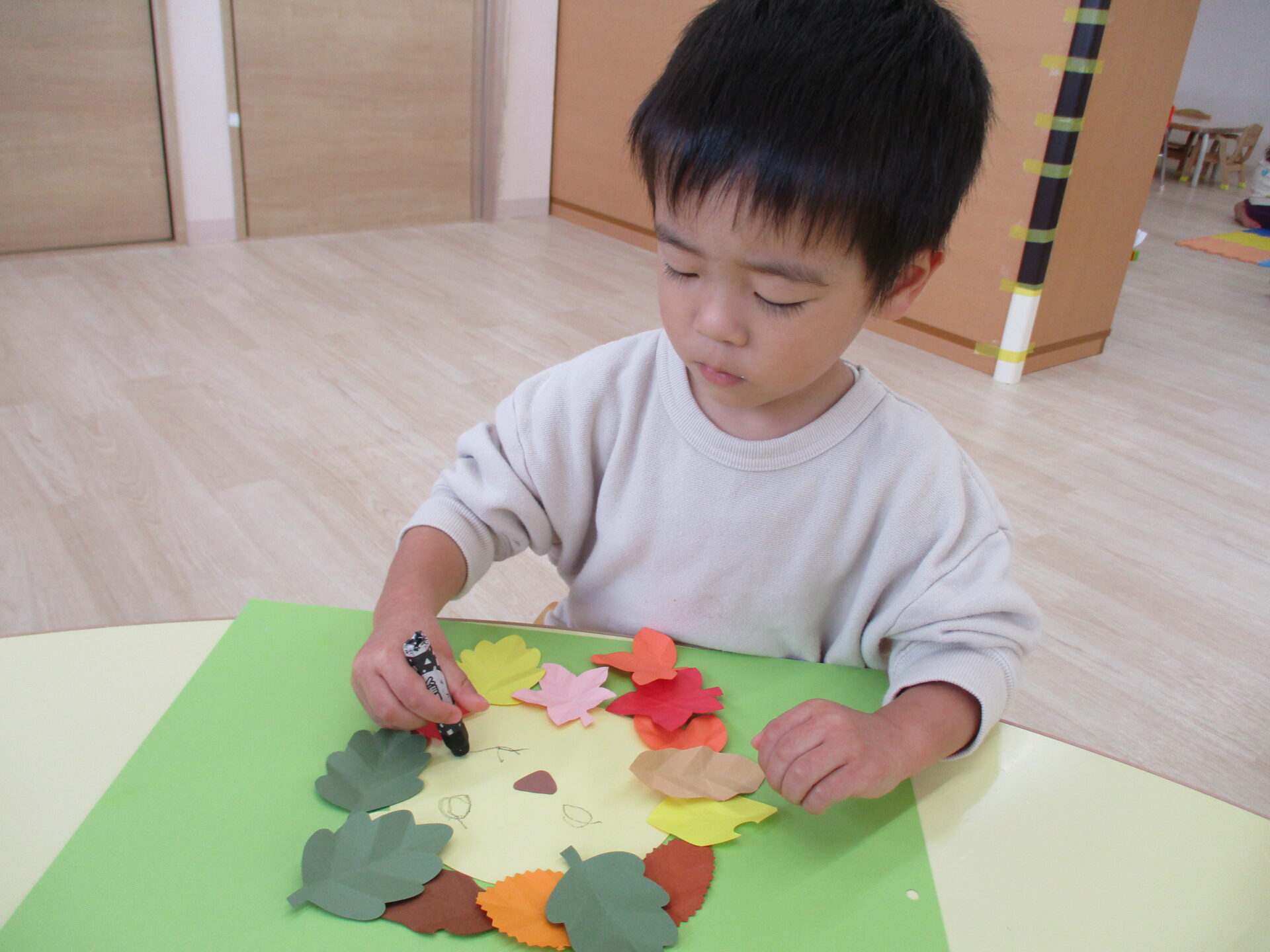 糊付けの後は、落ち葉の形に切った画用紙を顔の周りに貼っていきます。