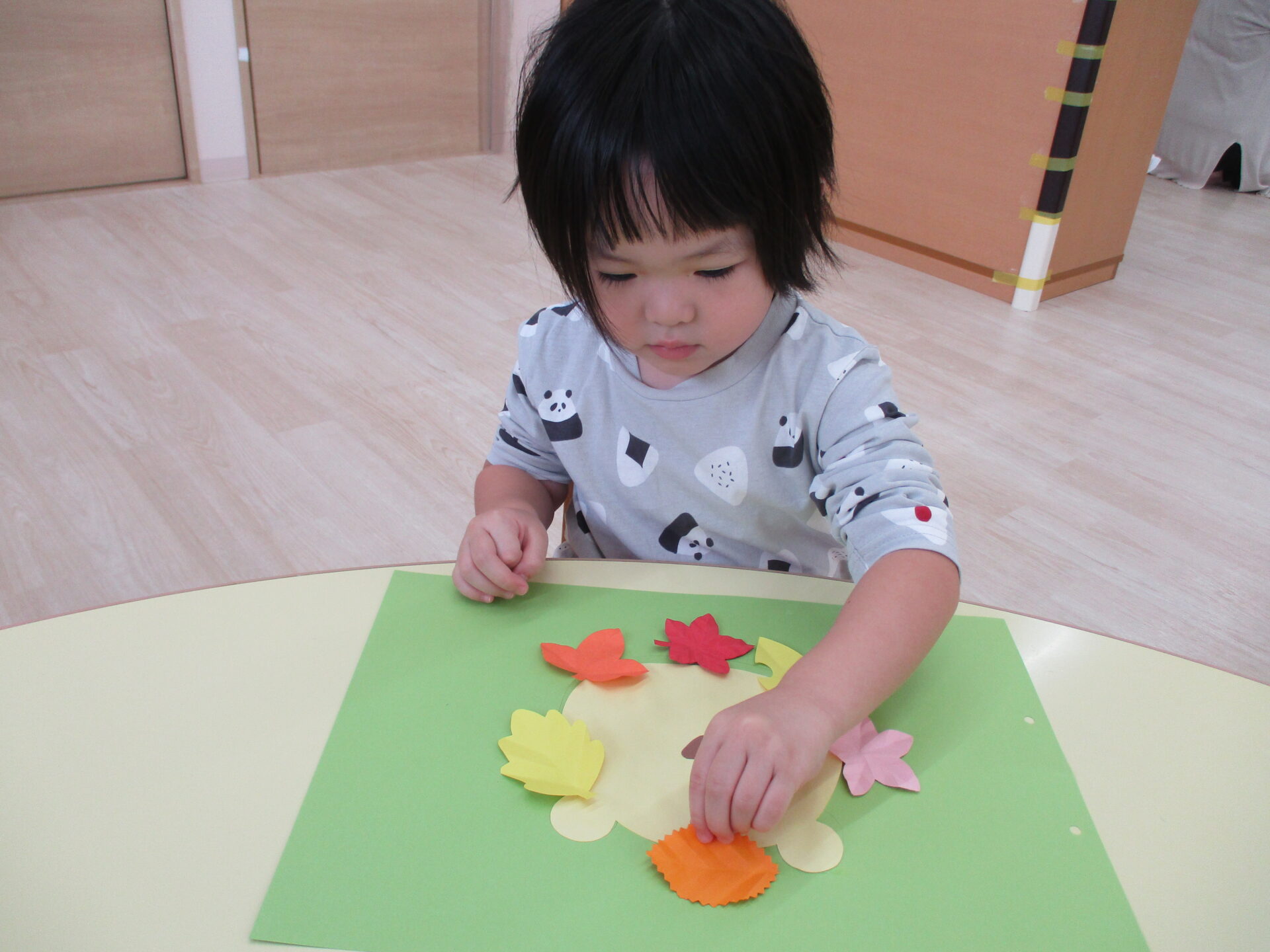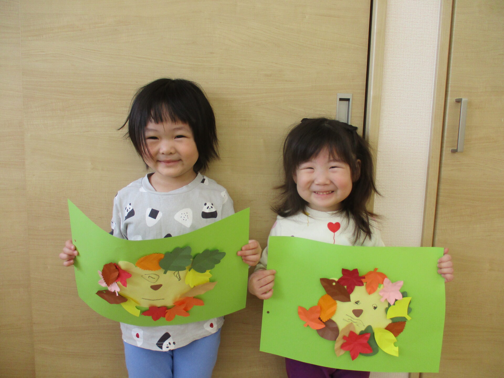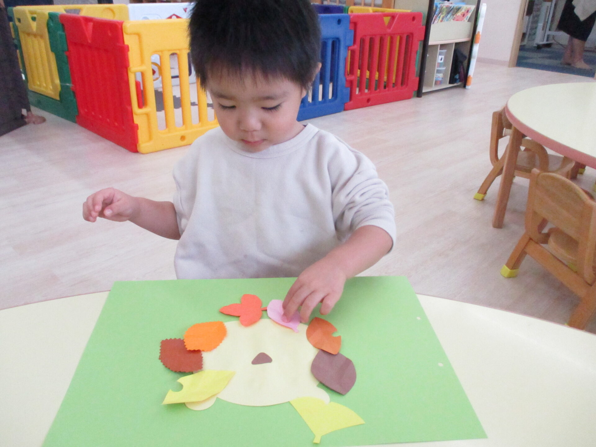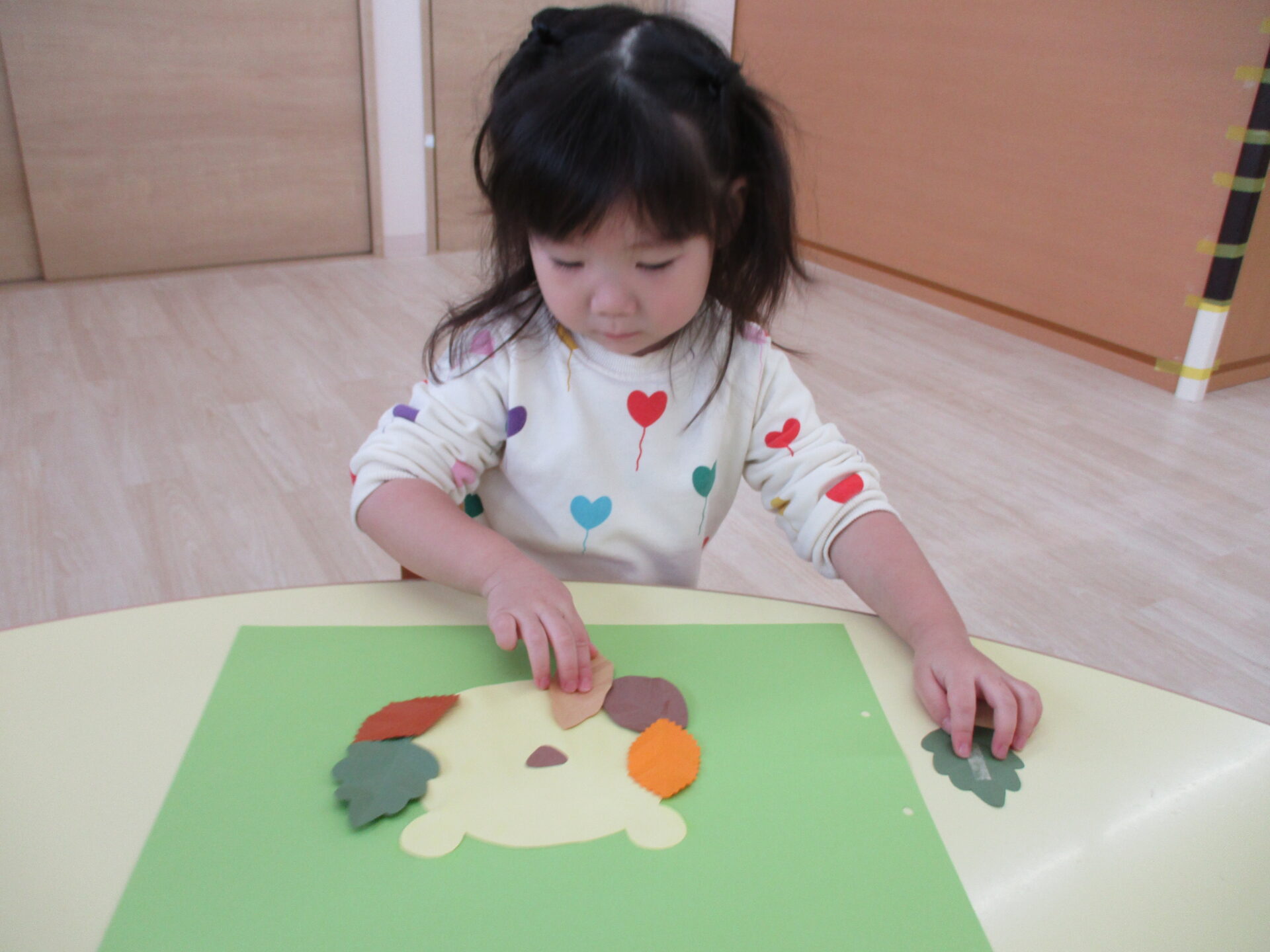 糊付けの後は、落ち葉の形に切った画用紙を顔の周りに貼っていきます。