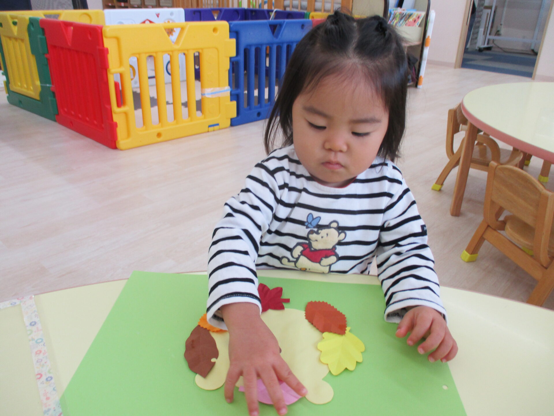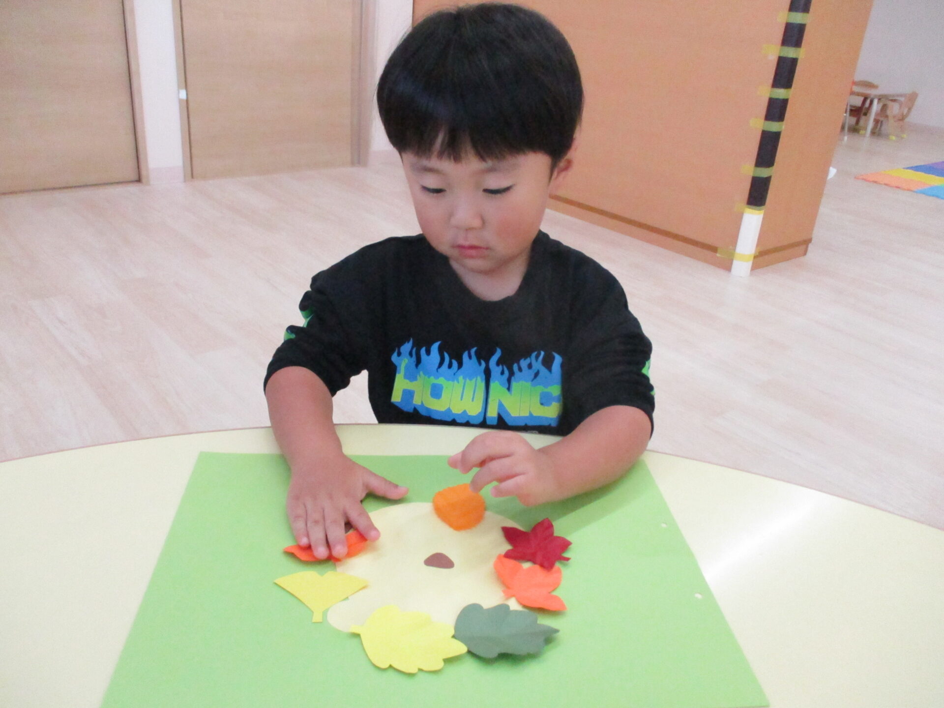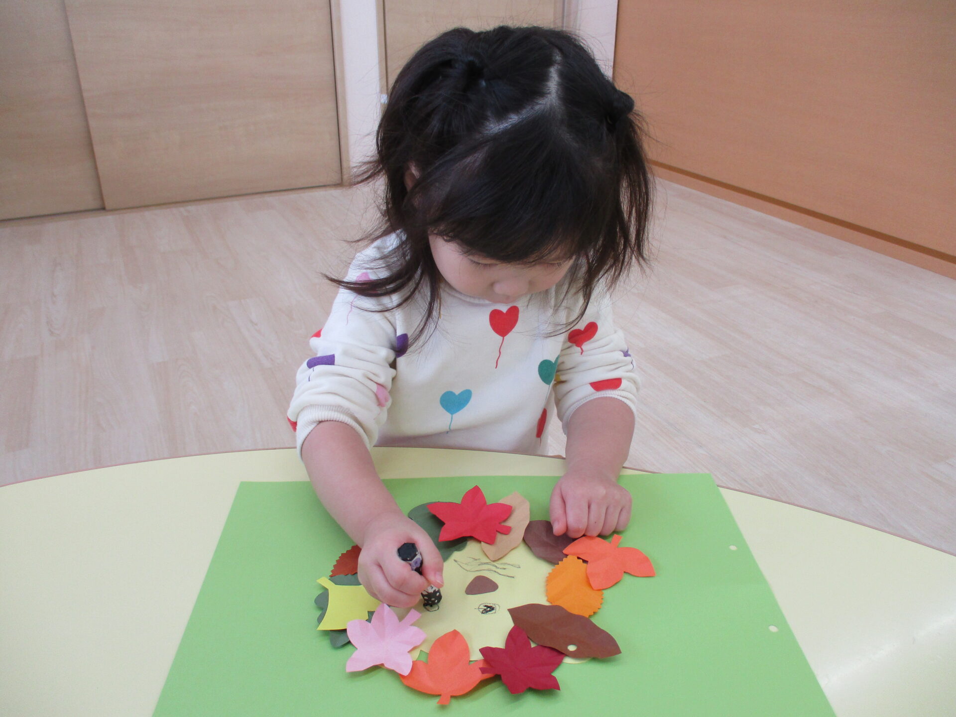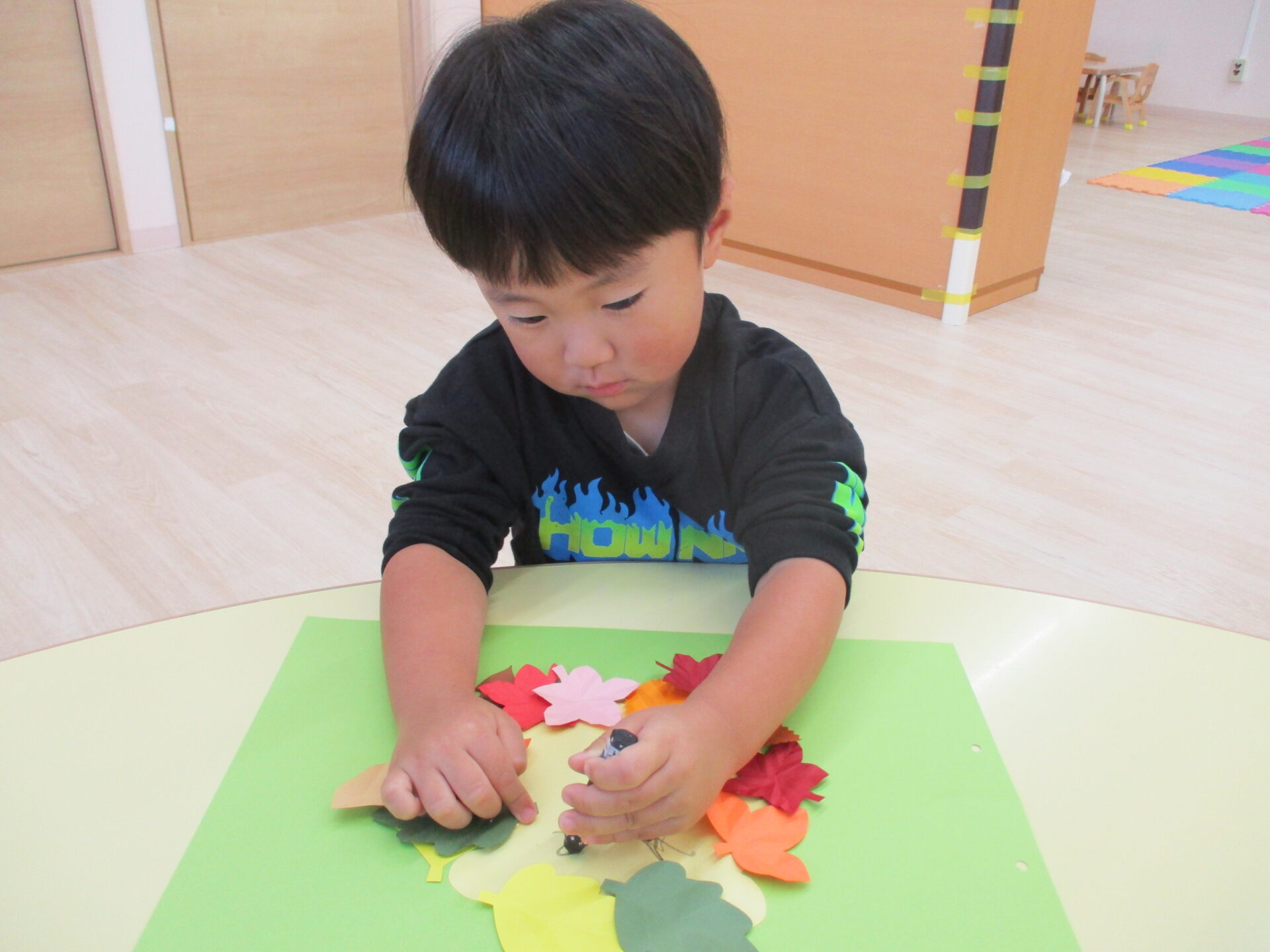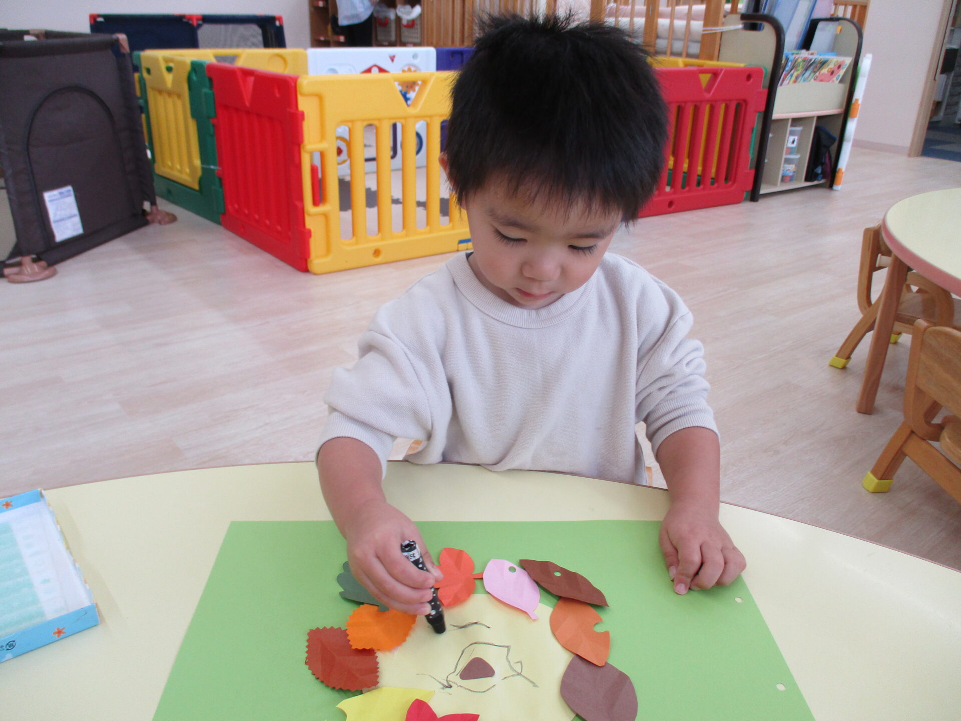 糊付けの後は、落ち葉の形に切った画用紙を顔の周りに貼っていきます。
