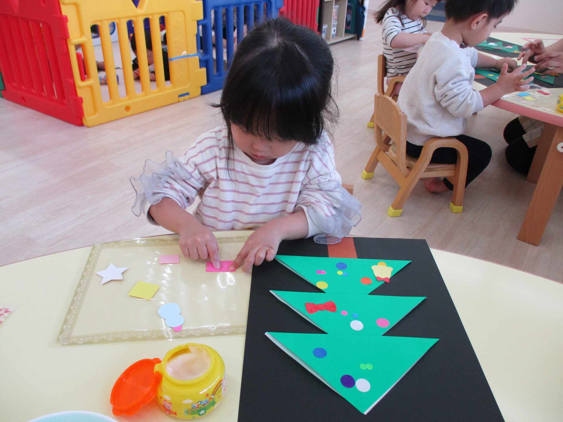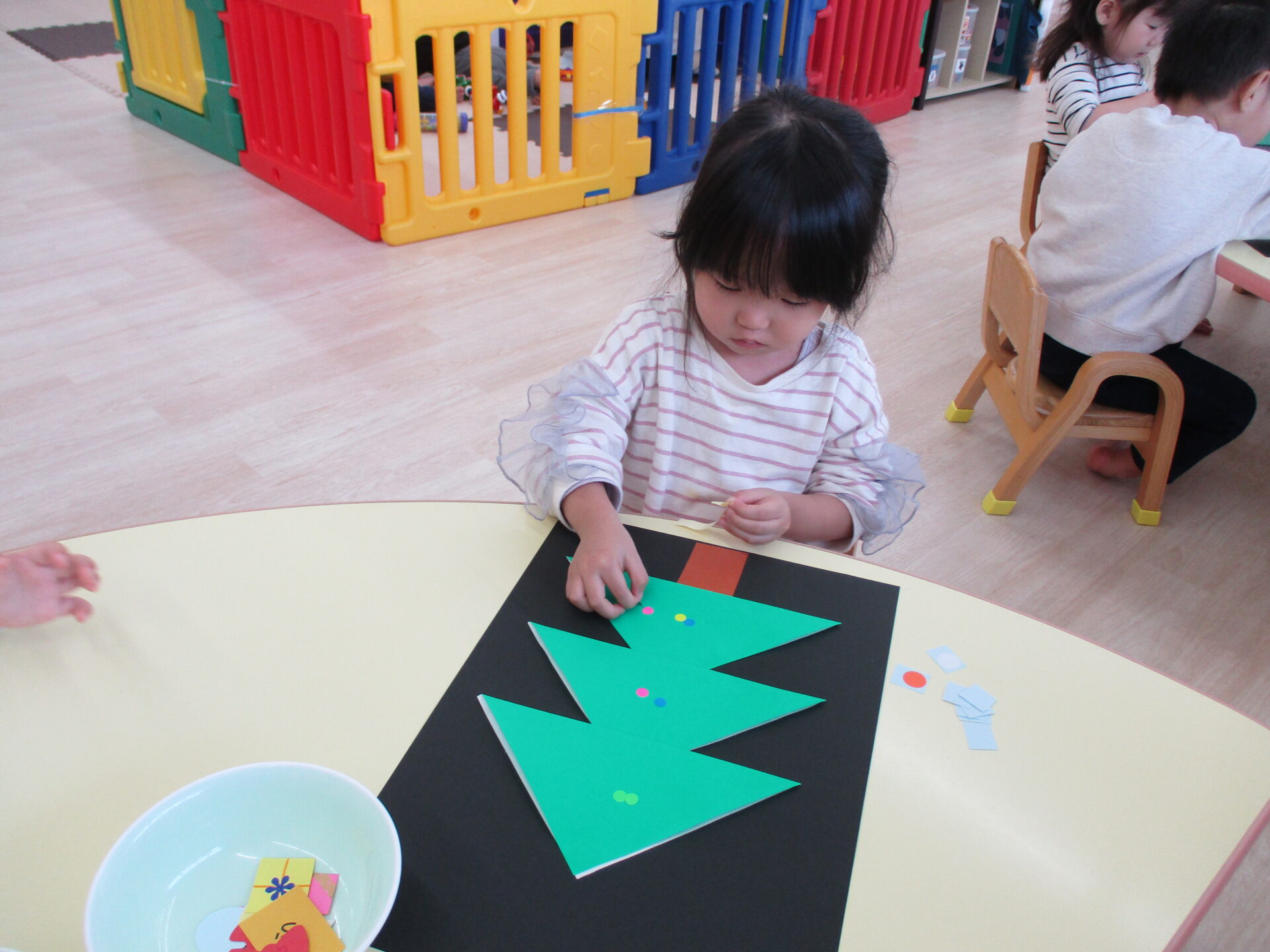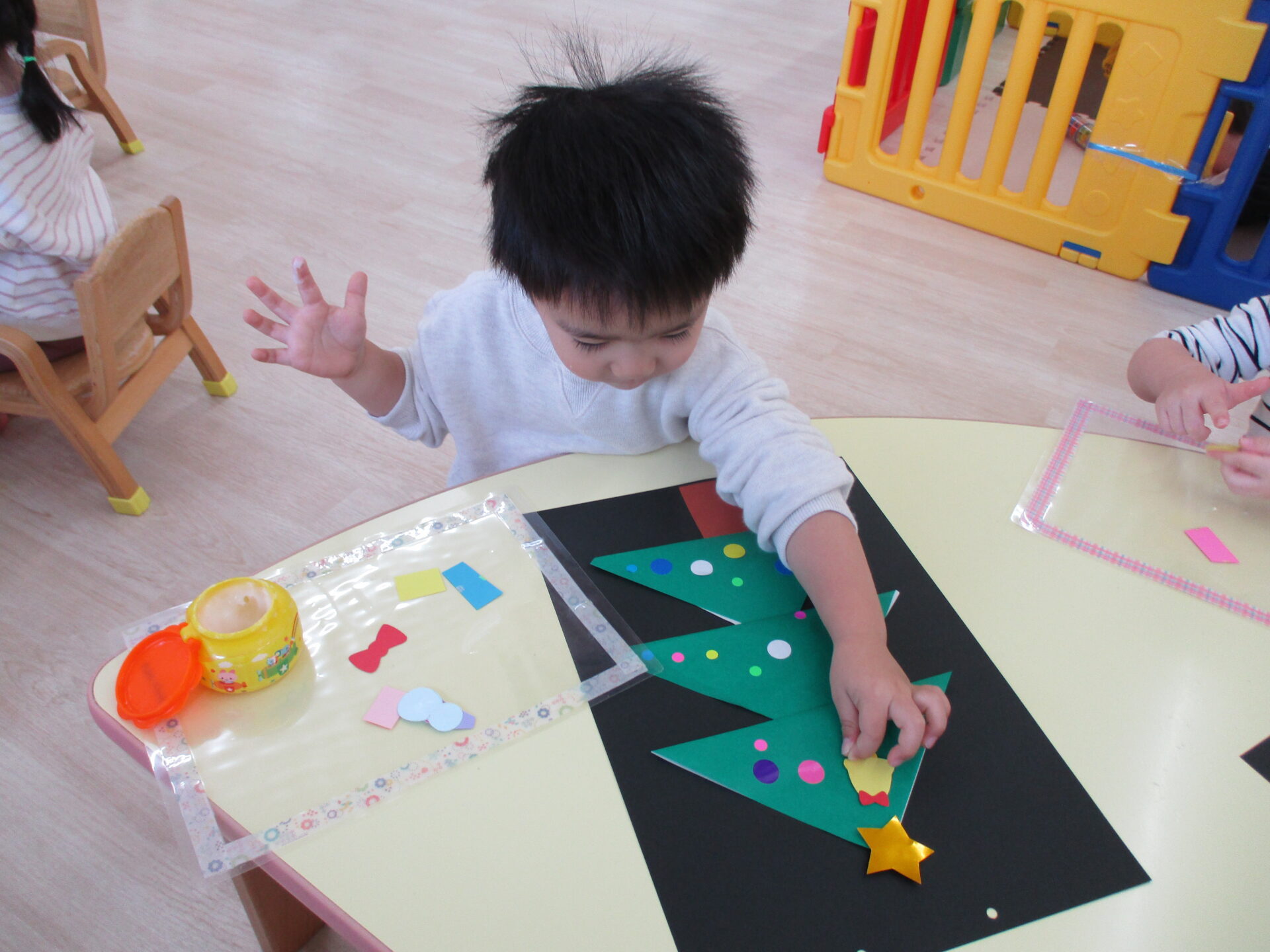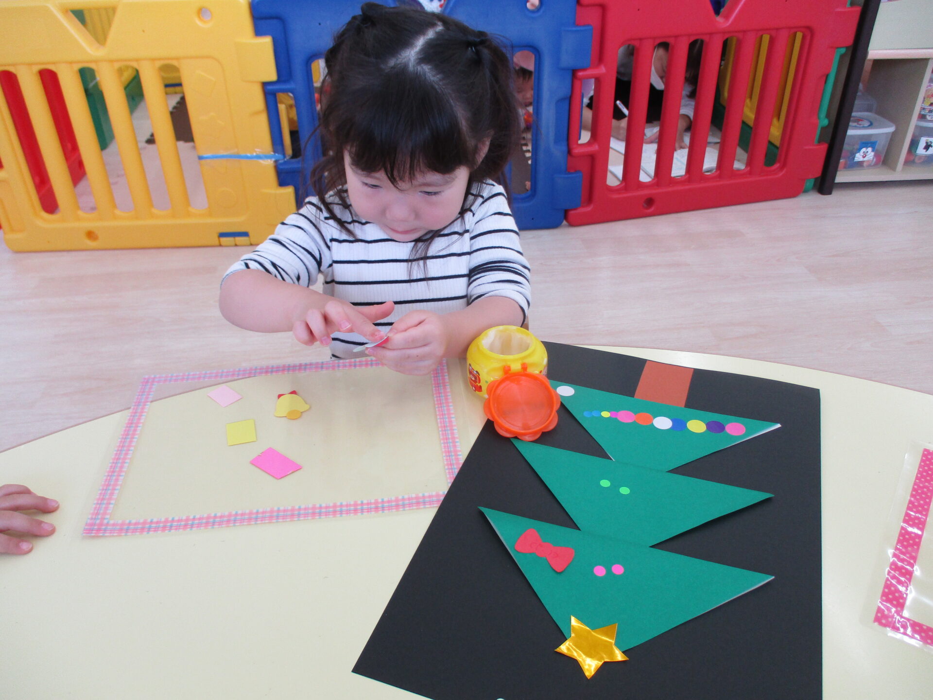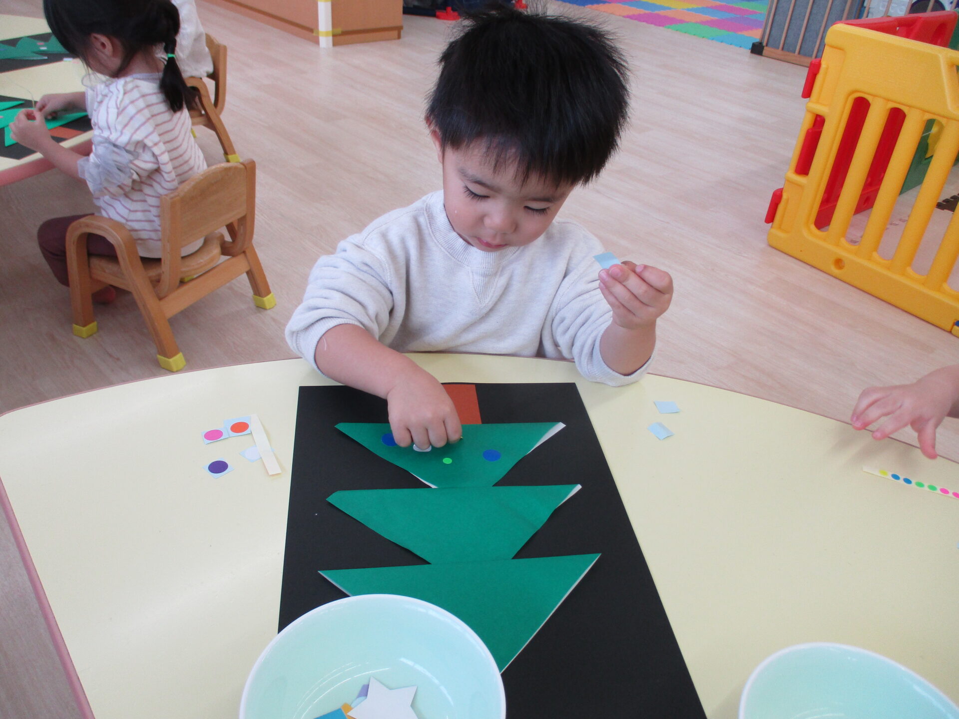 「きらきらの星だ~」「プレゼントいっぱいあるね」と嬉しそうにパーツを眺めながら貼っていました。