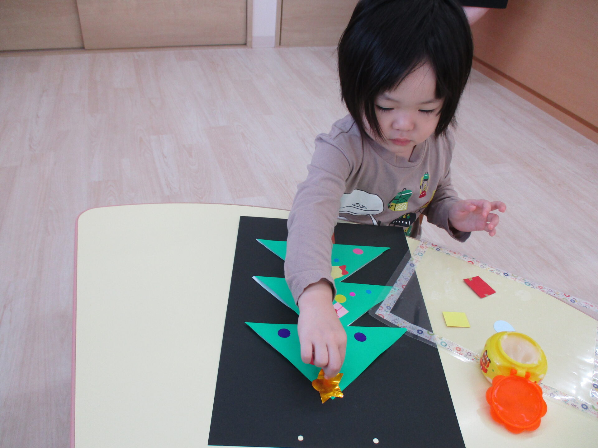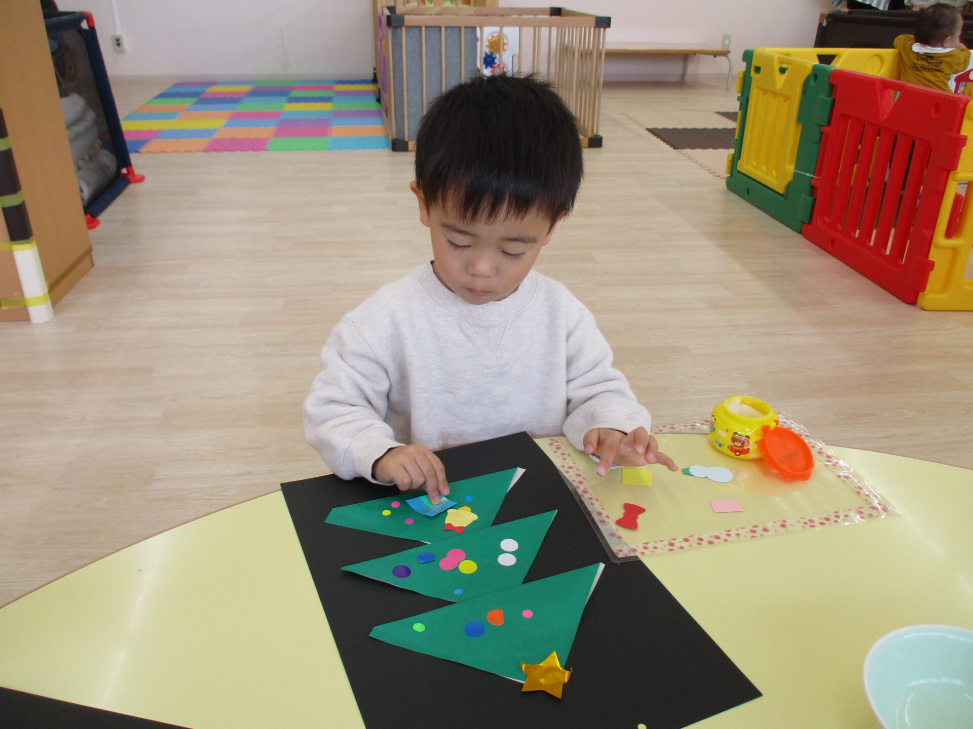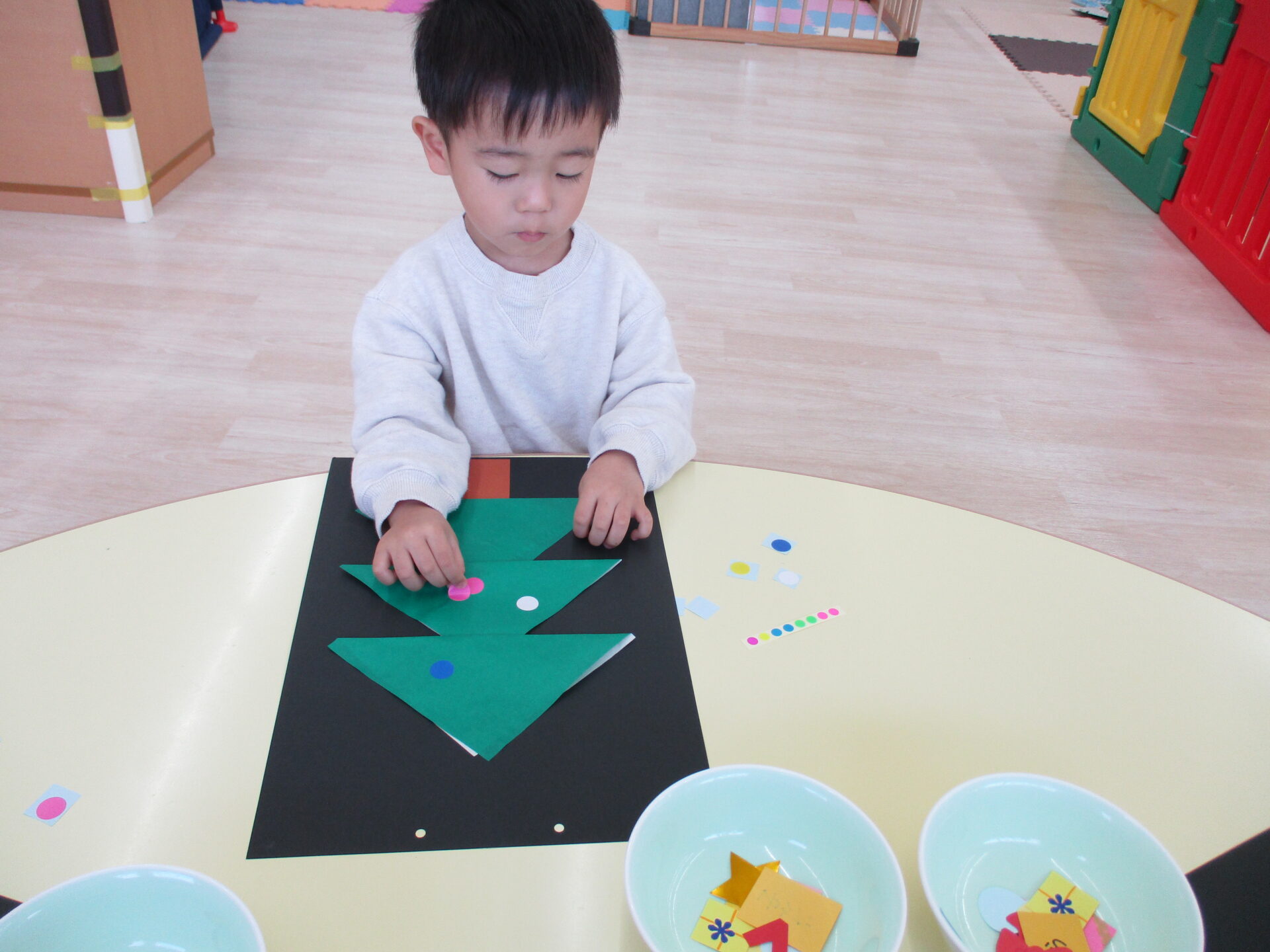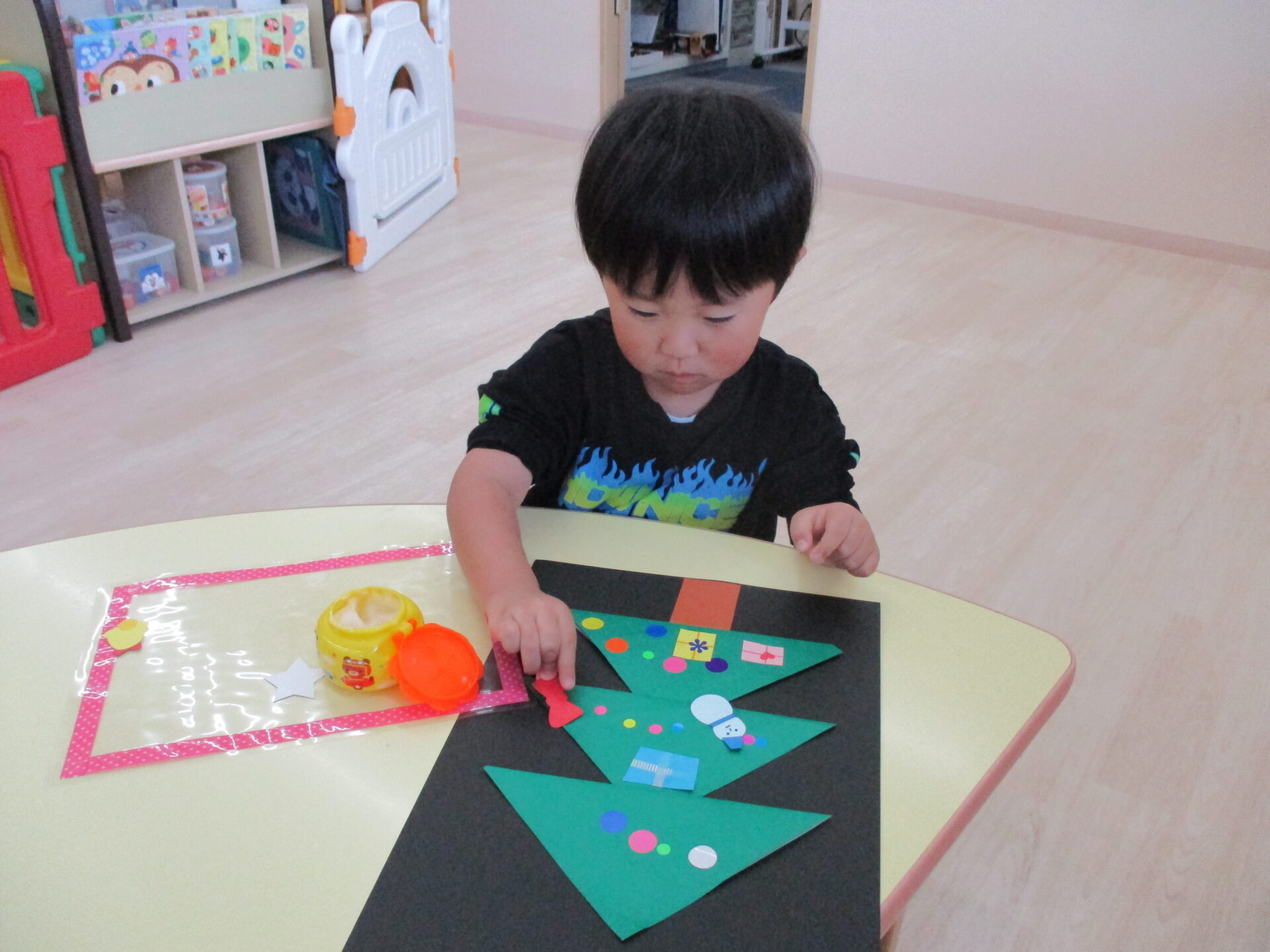 「きらきらの星だ~」「プレゼントいっぱいあるね」と嬉しそうにパーツを眺めながら貼っていました。