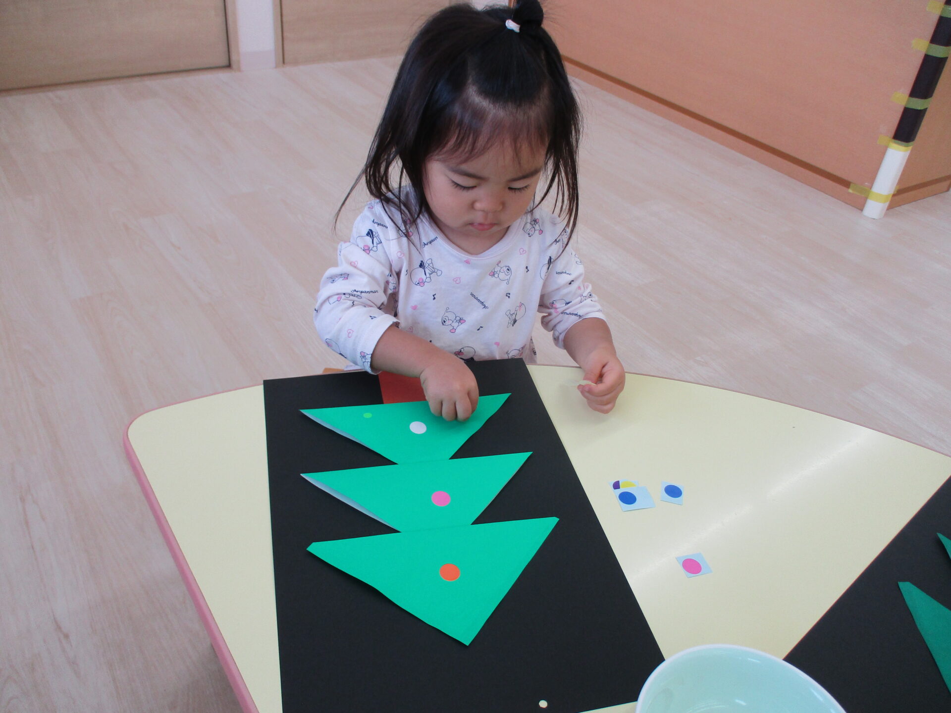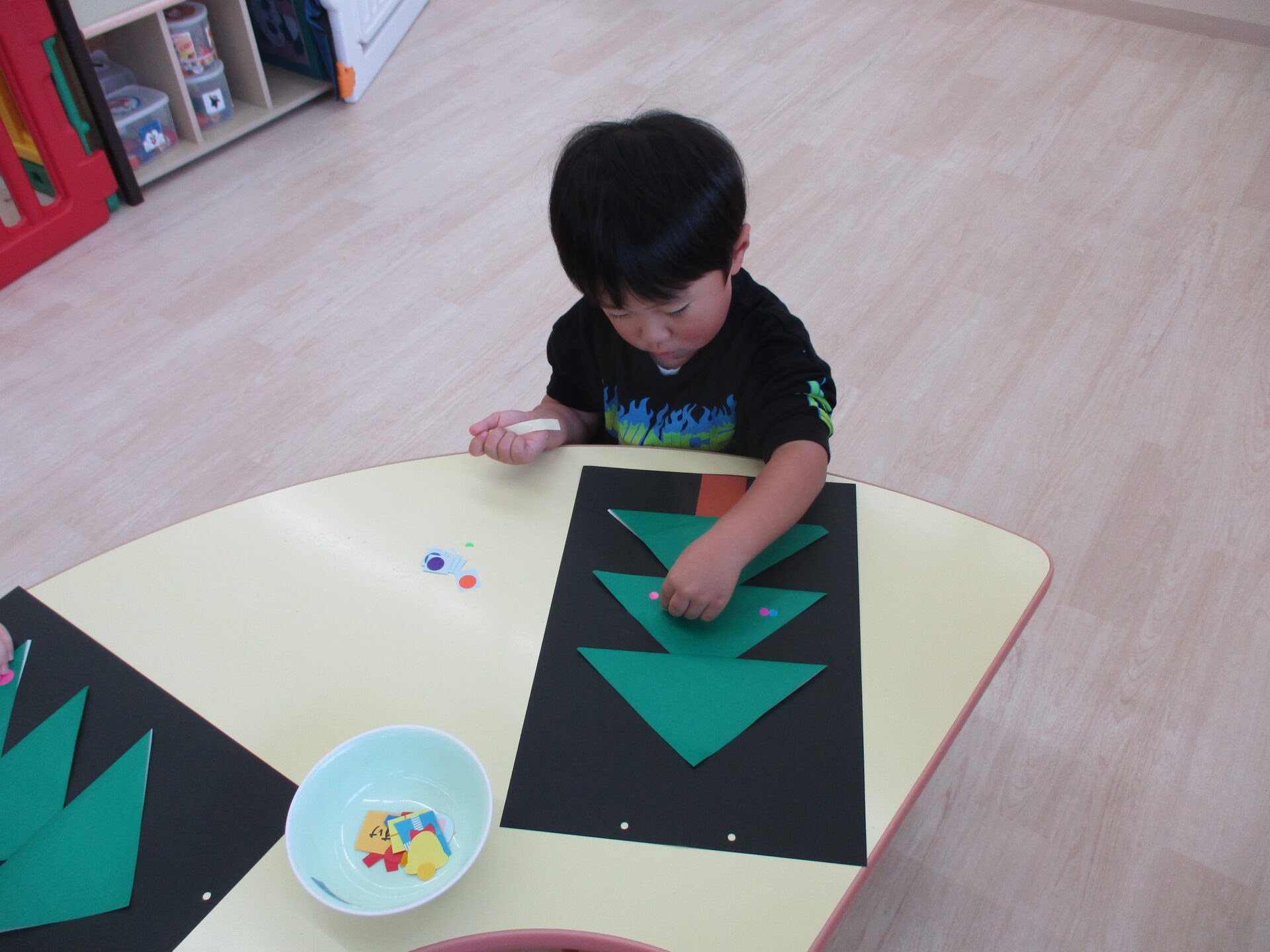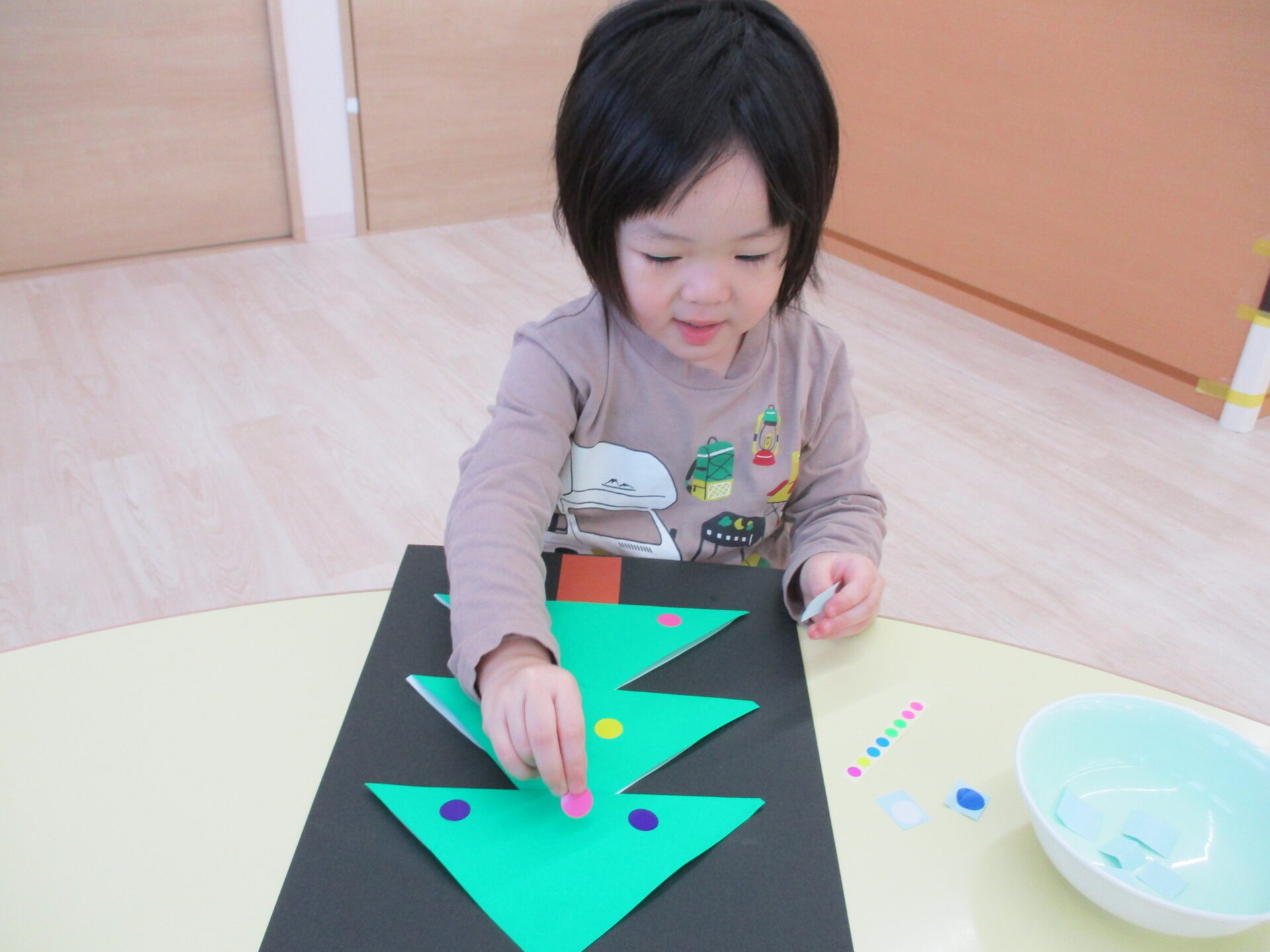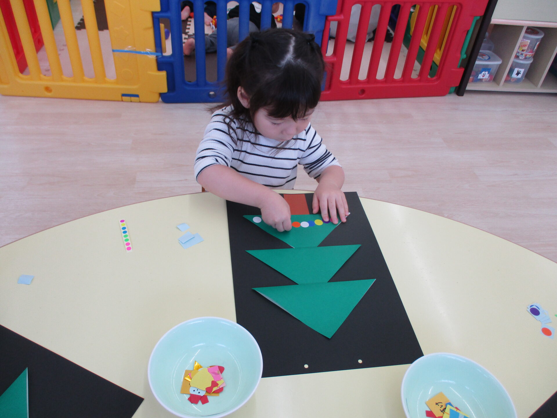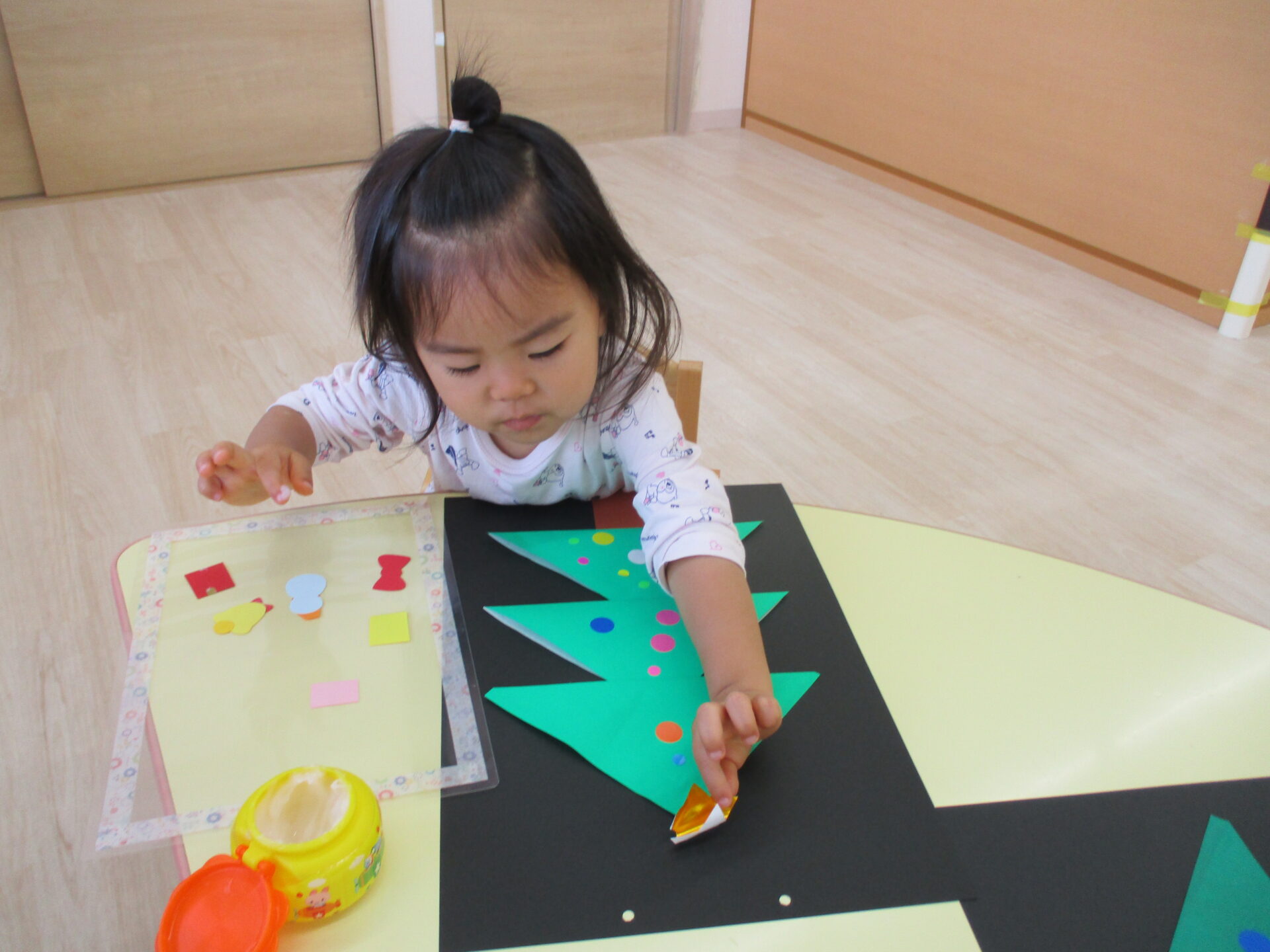 「きらきらの星だ~」「プレゼントいっぱいあるね」と嬉しそうにパーツを眺めながら貼っていました。