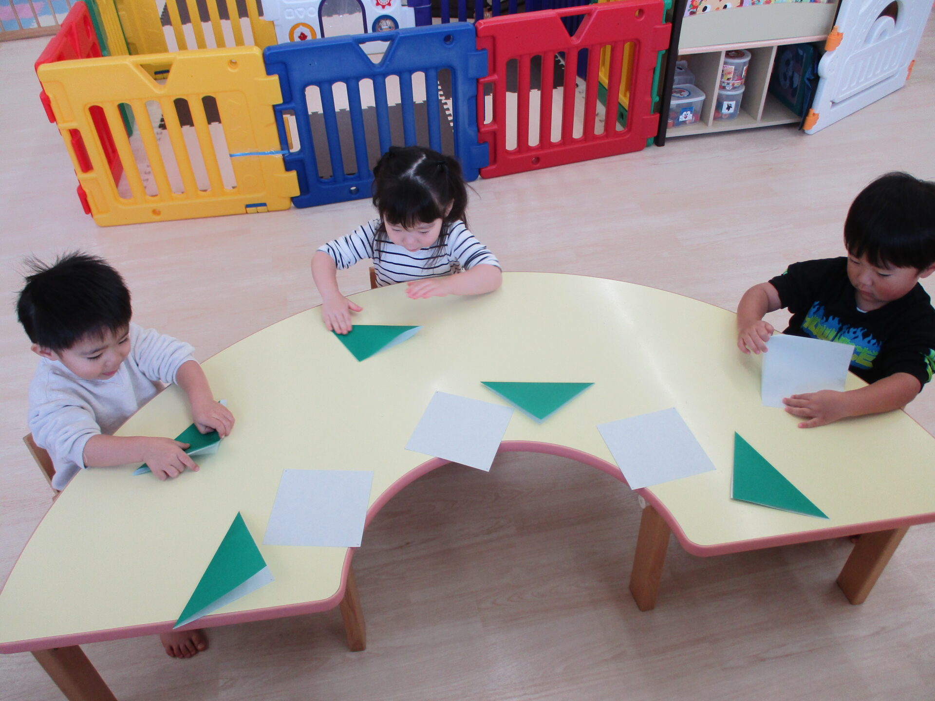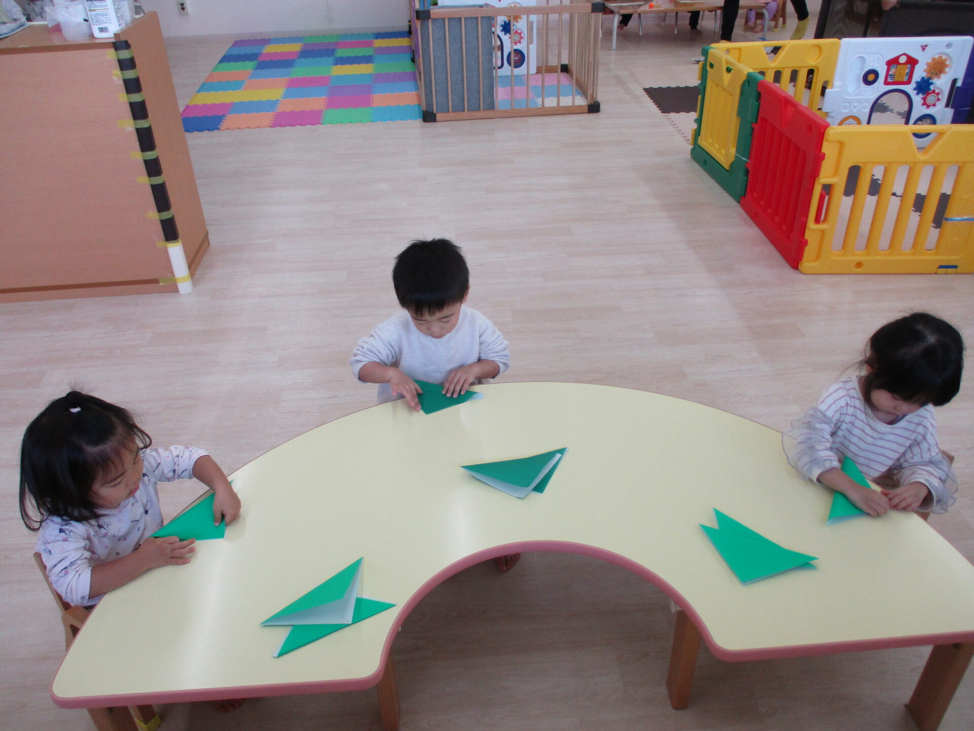 角がずれないようにしながら折っていく子ども達。