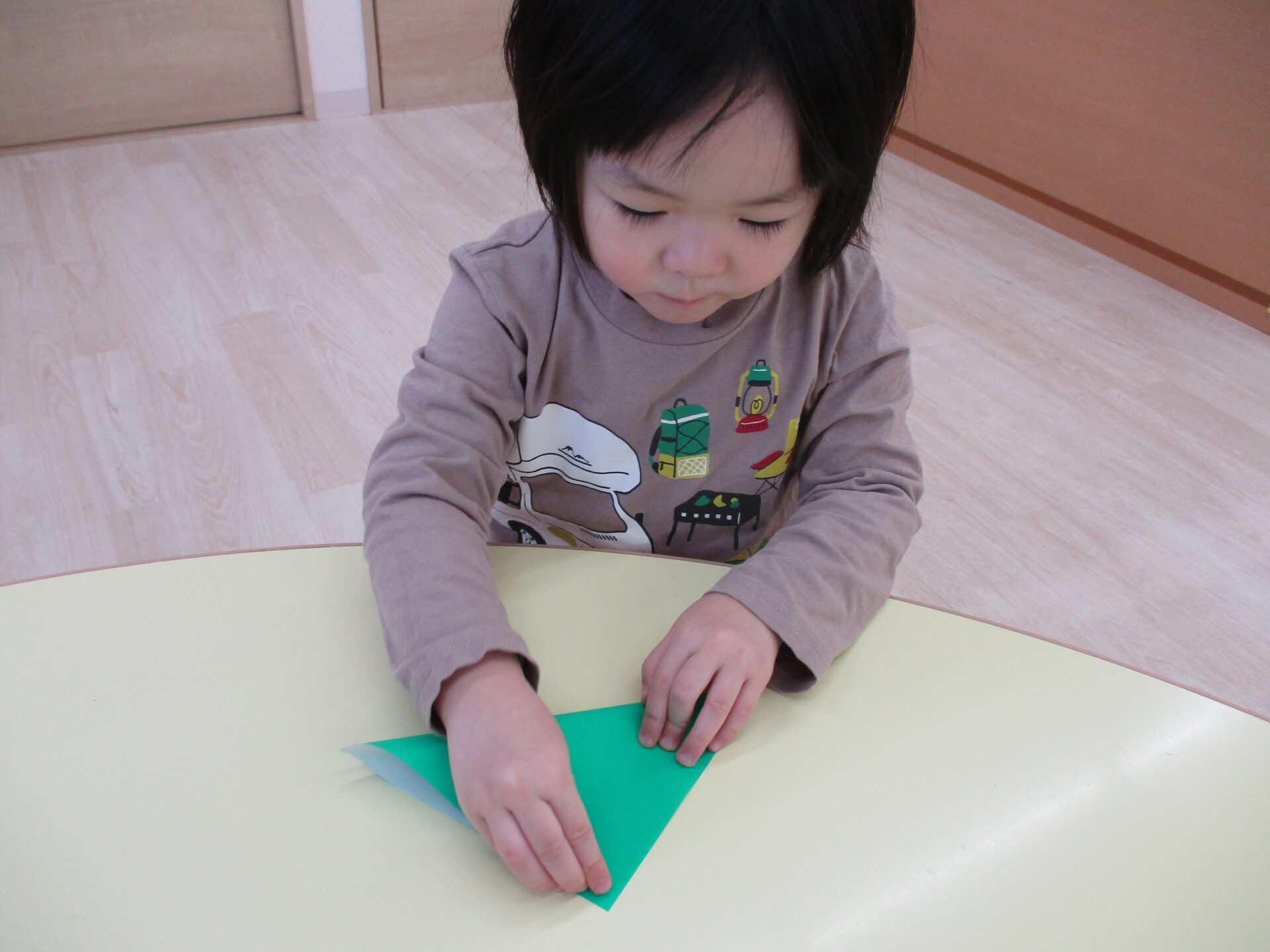 まずは緑色の折り紙を三角に折ります。