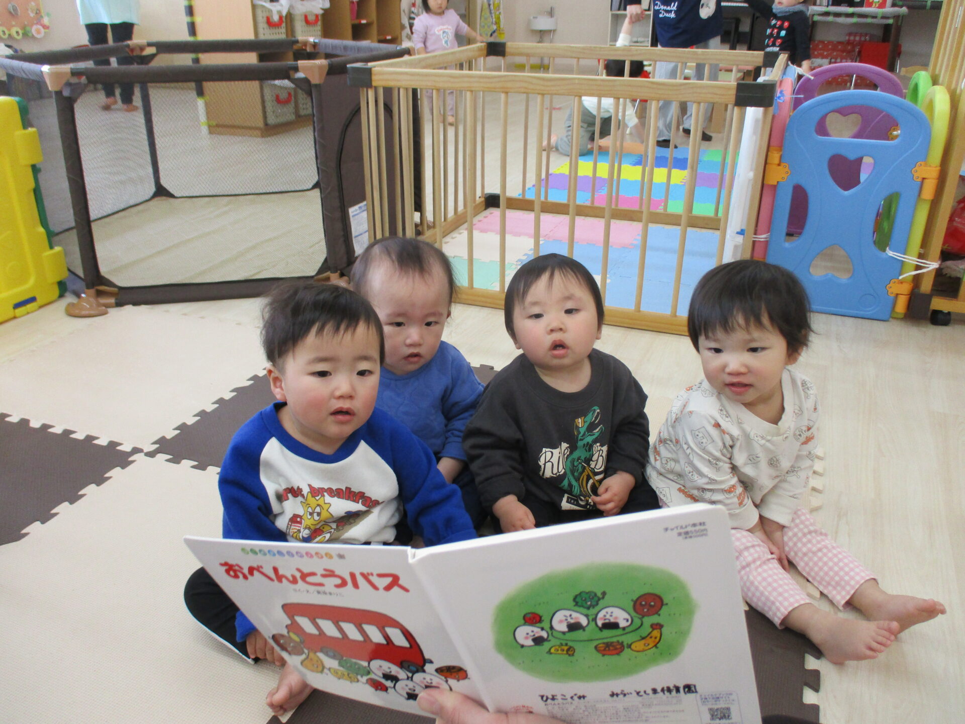 まずは先生に“おべんとうバス”の絵本を読んでもらいました。